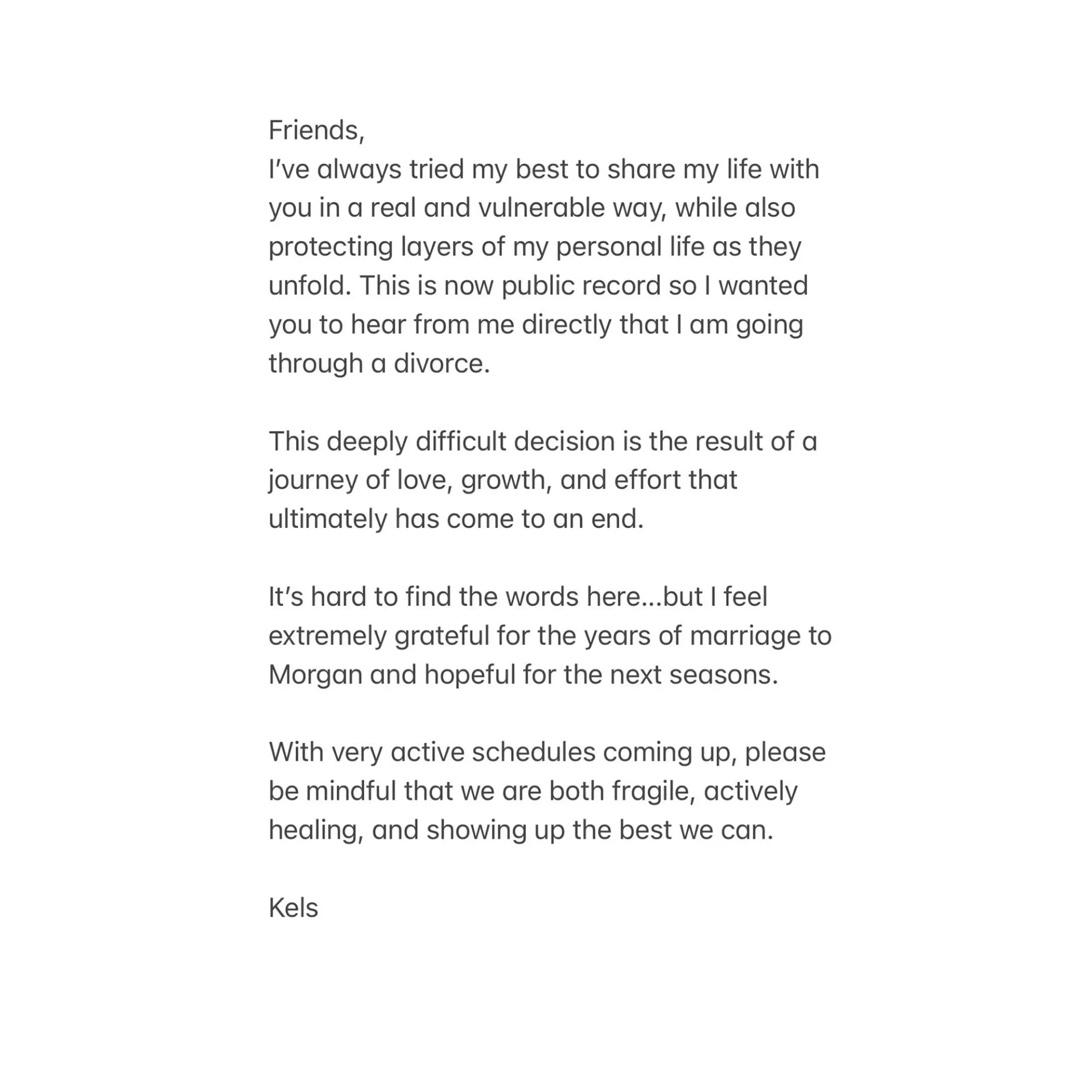 “Friends, I’ve always tried my best to share my life with you in a real and vulnerable way, while also protecting layers of my personal life as they unfold. This is now public record so I wanted you to hear from me directly that I am going through a divorce,” the “Heartfirst” singer wrote via Instagram Stories. “This deeply difficult decision is the result of a journey of love, growth, and effort that ultimately has come to an end. It’s hard to find the words here … but I feel extremely grateful for the years of marriage to Morgan and hopeful for the next seasons.”