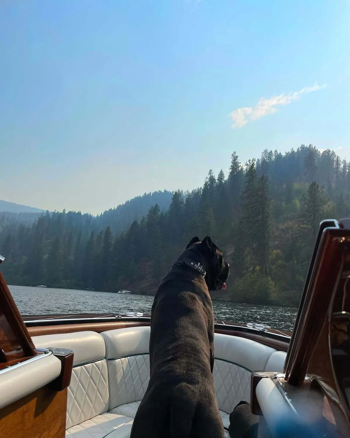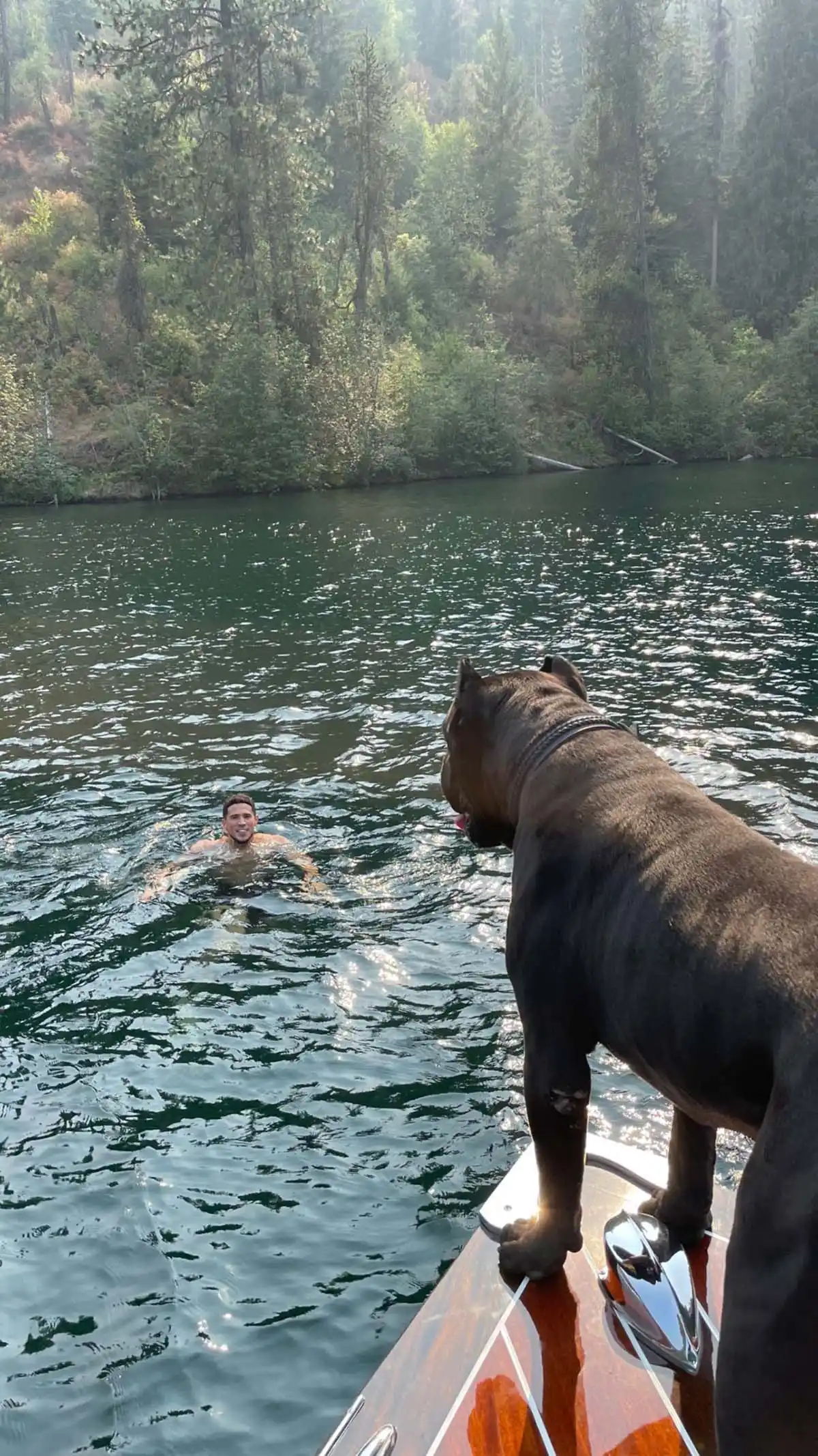 Booker’s dog, Haven, made the traveling squad as well. He was spotted riding on the boat and taking in the beautiful views. In another photo, the basketball player’s pooch stood at attention on the tip of the vessel after Booker jumped into the open water.