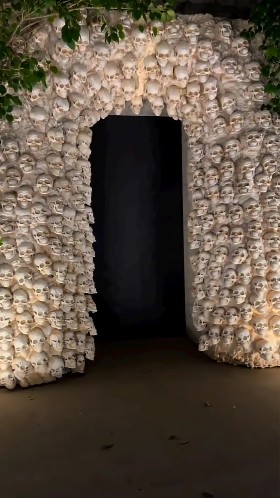 Kardashian continued with the tour and filmed the archway of skulls right outside the house. “I definitely wanted a more tonal palette this year,” she explained. The Kourtney and Kim Take New York alum then walked inside, revealing some eerie updates to the minimalist home: ample spiderwebs hanging from the ceiling and mummified figures lining a long hallway. “We have a really creepy situation going on in here,” she said.