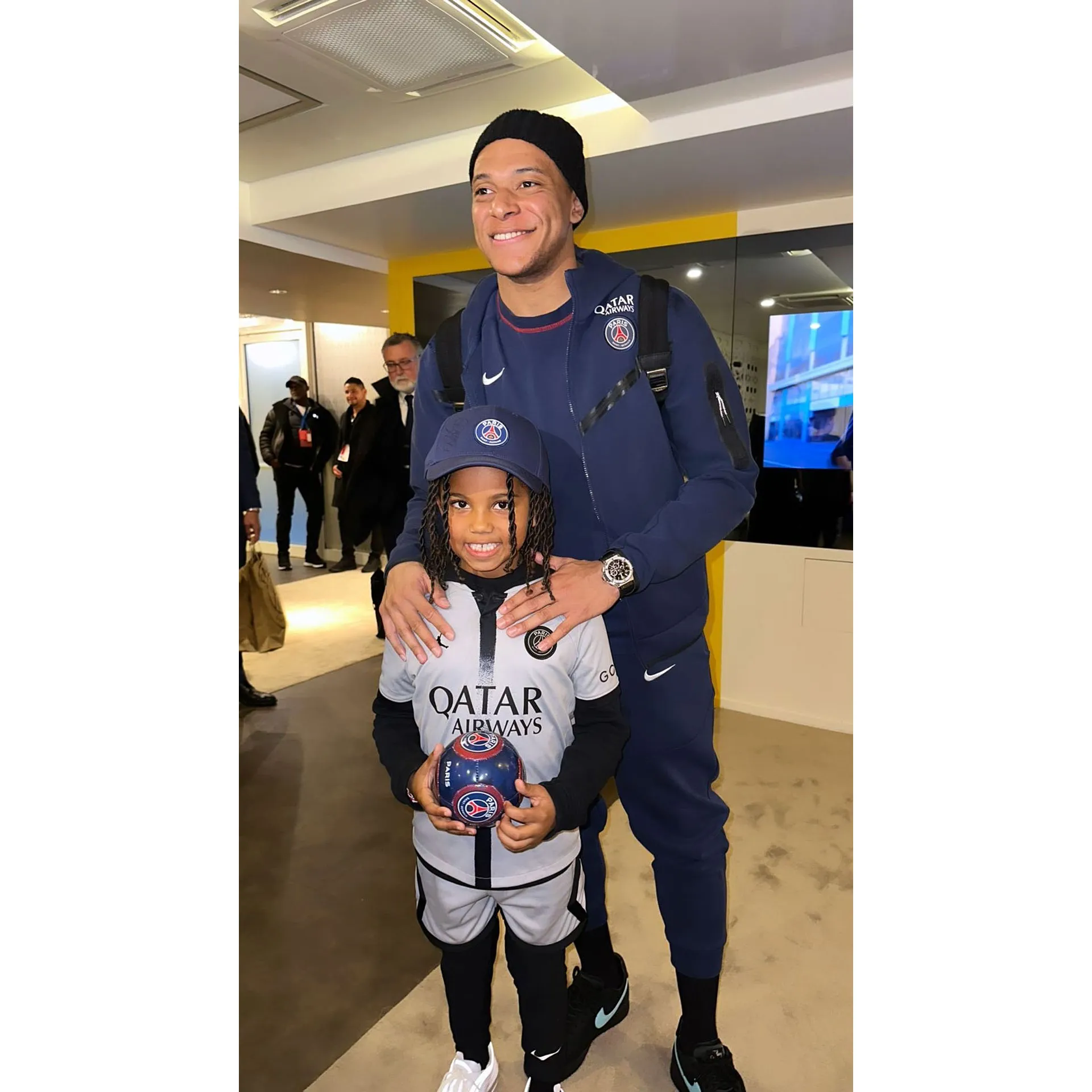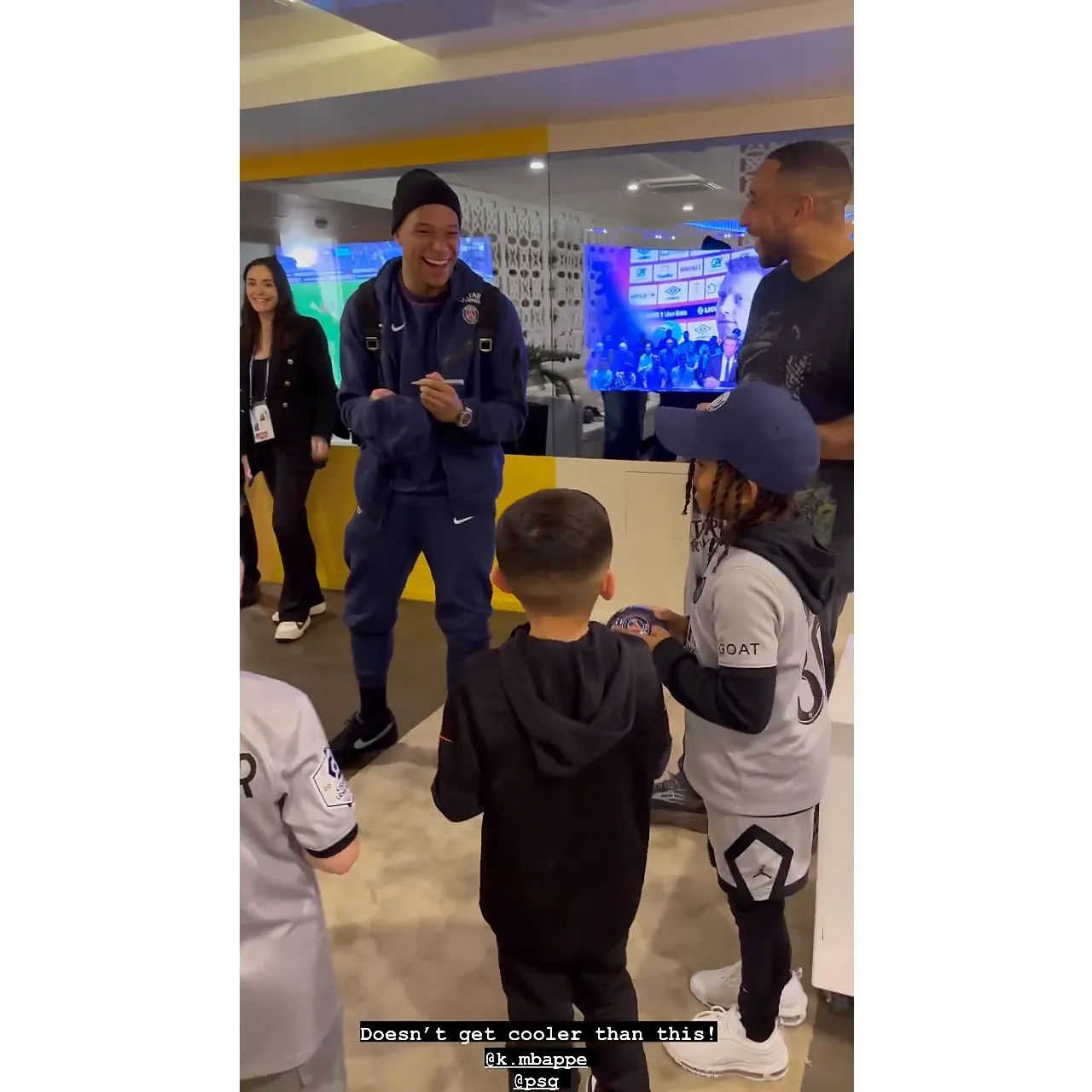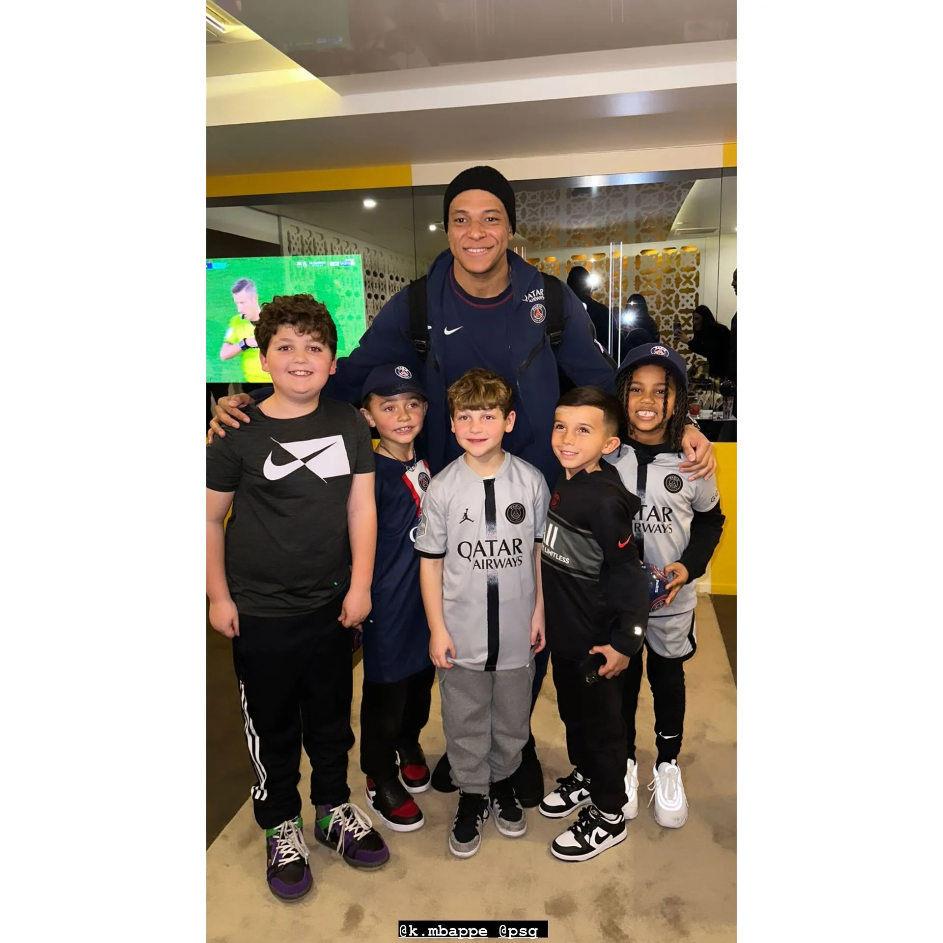 After the game, the crew got to meet Kylian Mbappé, who posed for photos with them and signed autographs. “Doesn’t get cooler than this,” Kardashian wrote via Instagram, sharing a video of the athlete, 24, interacting with the boys.