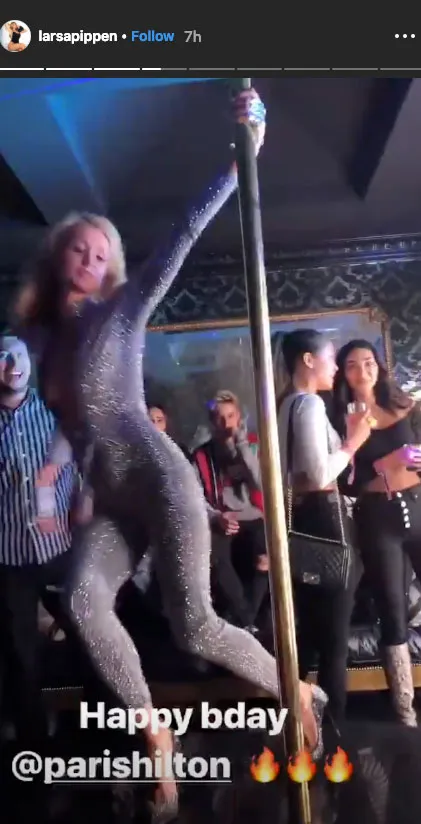 That wasn’t the only time Hilton showed off her moves during the fun-filled night. At one point, Pippen, 44, captured the Simple Life alum getting down to some tunes alongside floor-to-ceiling sparklers, before dancing on a pole.