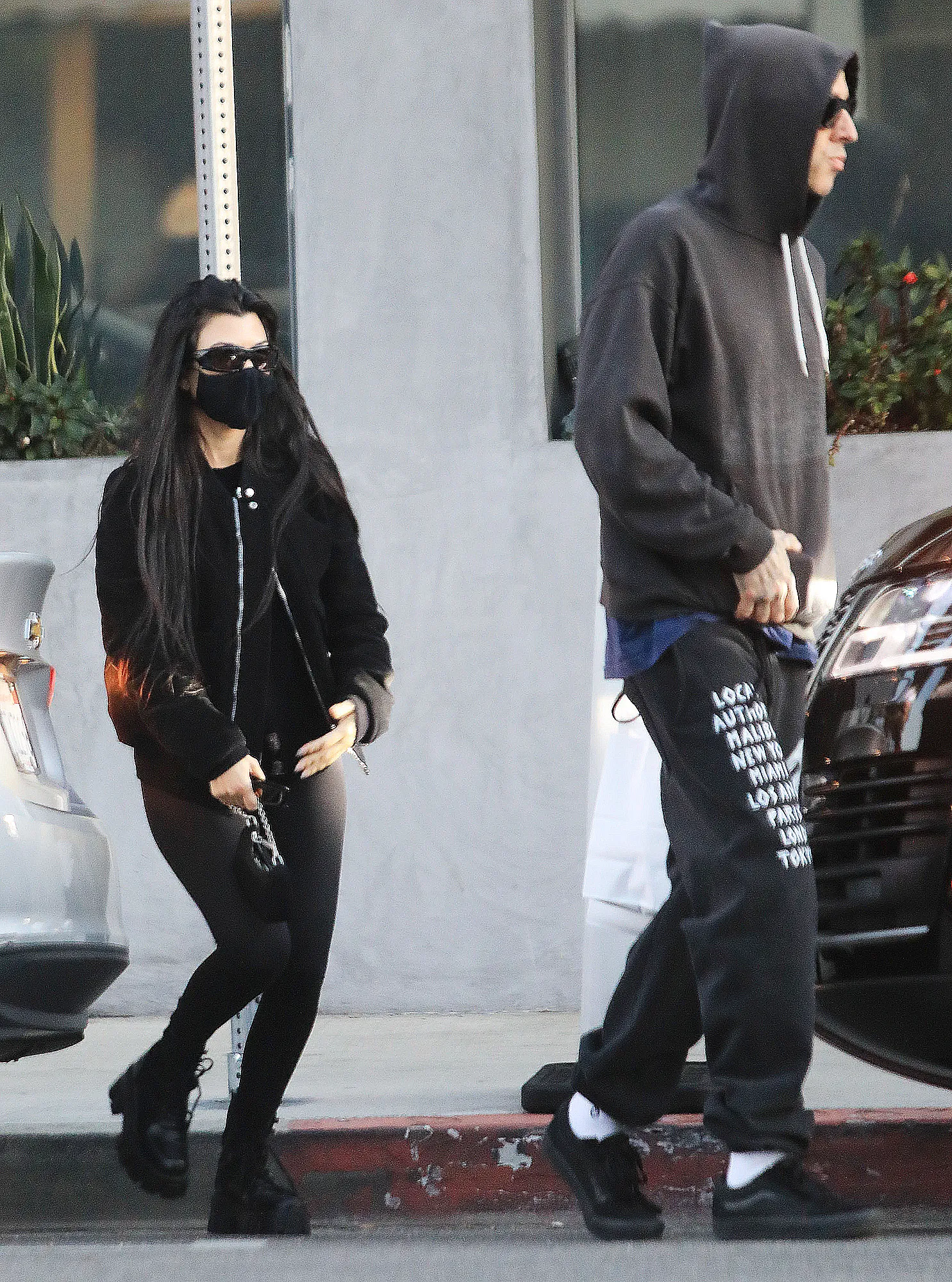 The couple dressed down for the outing, with the Poosh founder in an all-black ensemble and matching face mask and the Blink-182 drummer in a gray hoodie, black sweatpants and black sneakers.