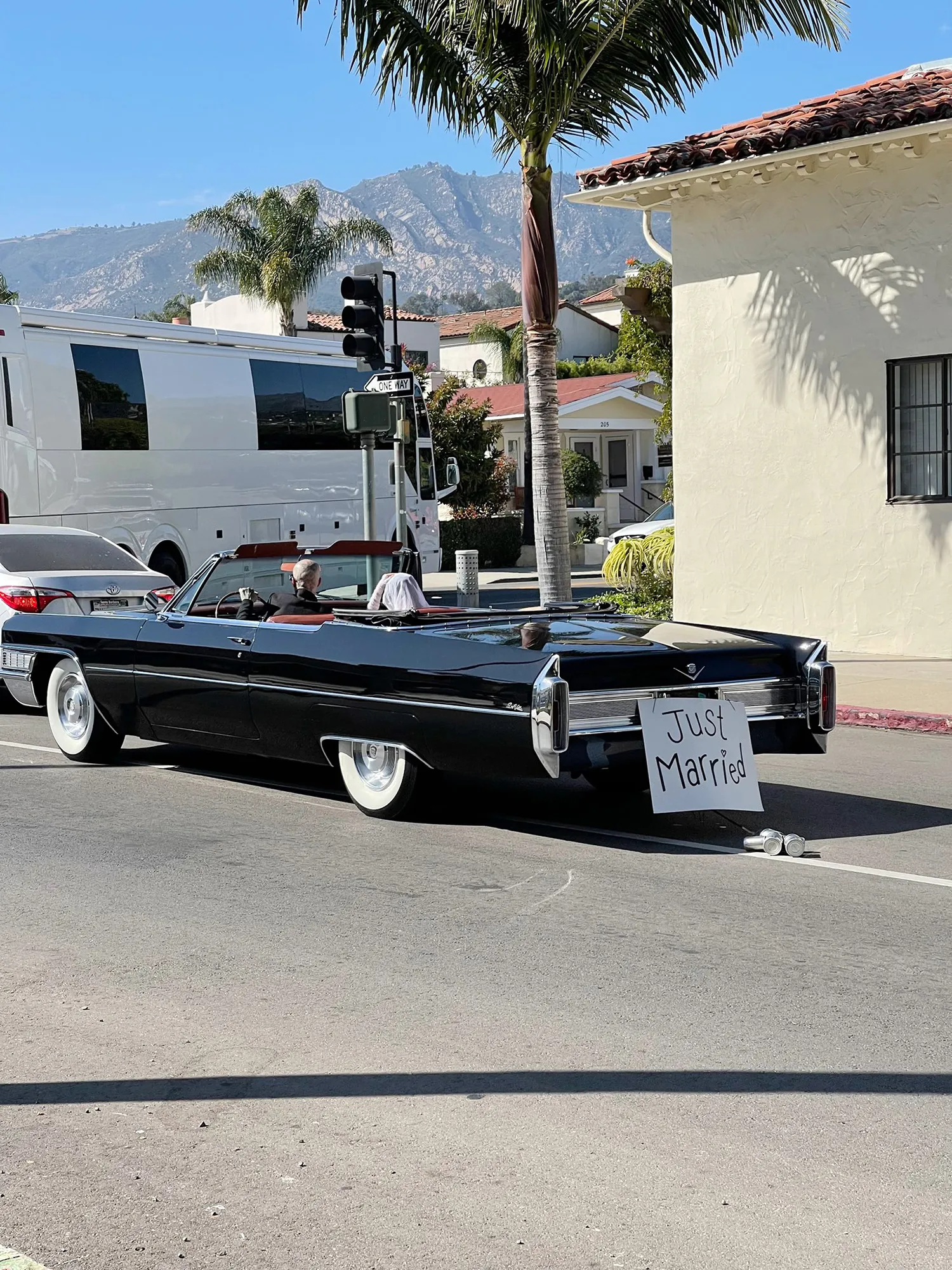 The engaged stars were photographed outside a courthouse in Santa Barbara in photos obtained by TMZ. Kardashian, 43, wore a white custom Dolce and Gabbana mini dress and a veil while Barker, 46, wore a black-on-black suit. They posed by a black convertible baring a “Just Married” sign on the back, and the outlet reports that the two exchanged vows outside the downtown courthouse.