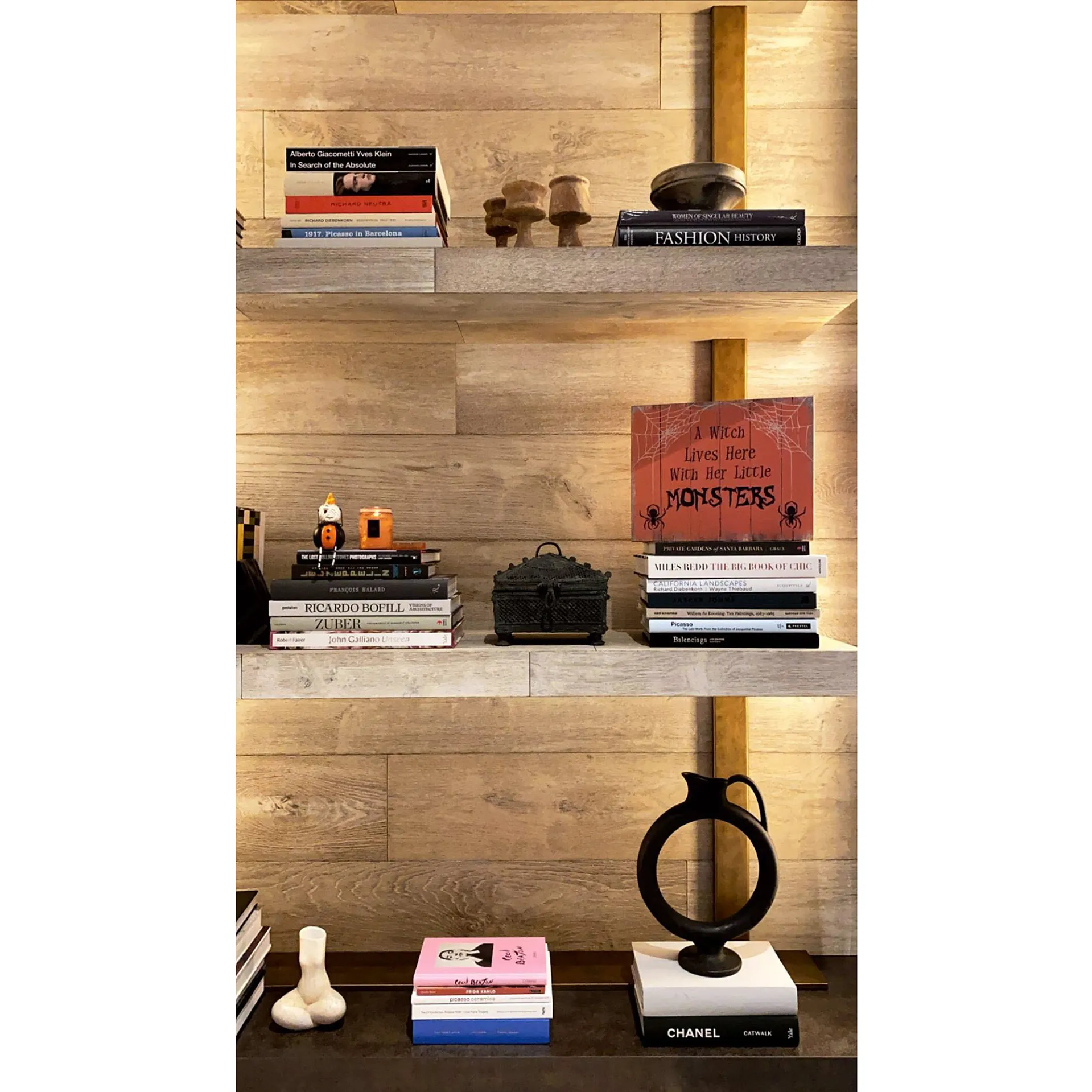 The Life of Kylie alum posted a photo of two witch statues captioned, “My friends.” Jenner moved on to show off a tile on her bookcase which read, “A witch lives here with her little monsters.”
