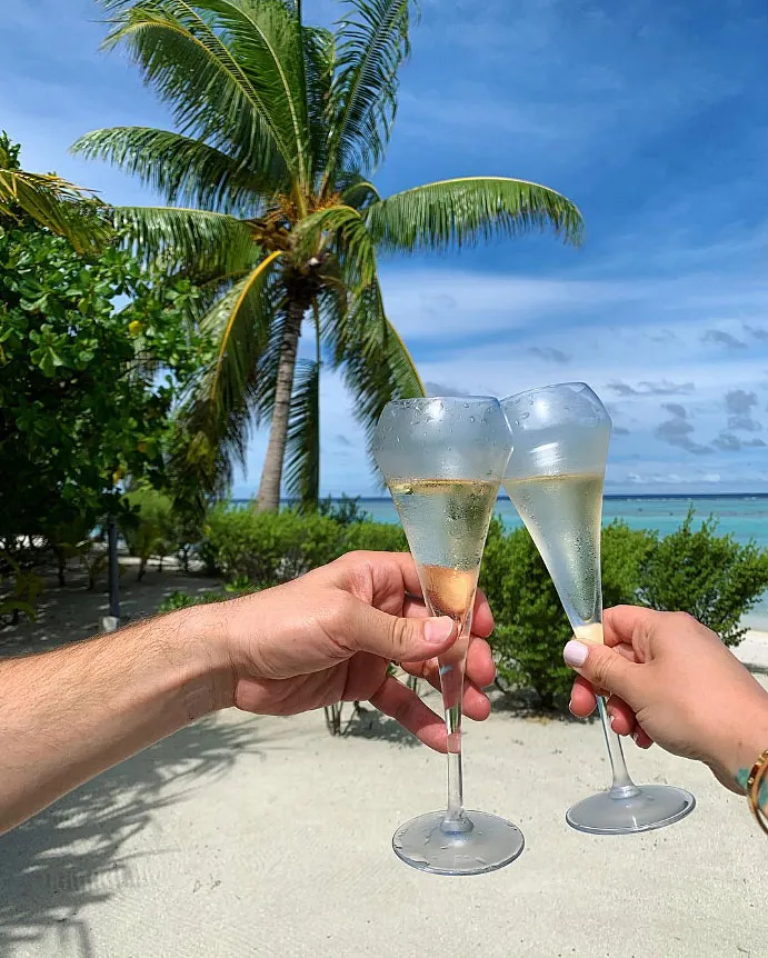 Among the photos was one of the actress in a striped bikini, and another that showed her and her spouse clinking champagne glasses.