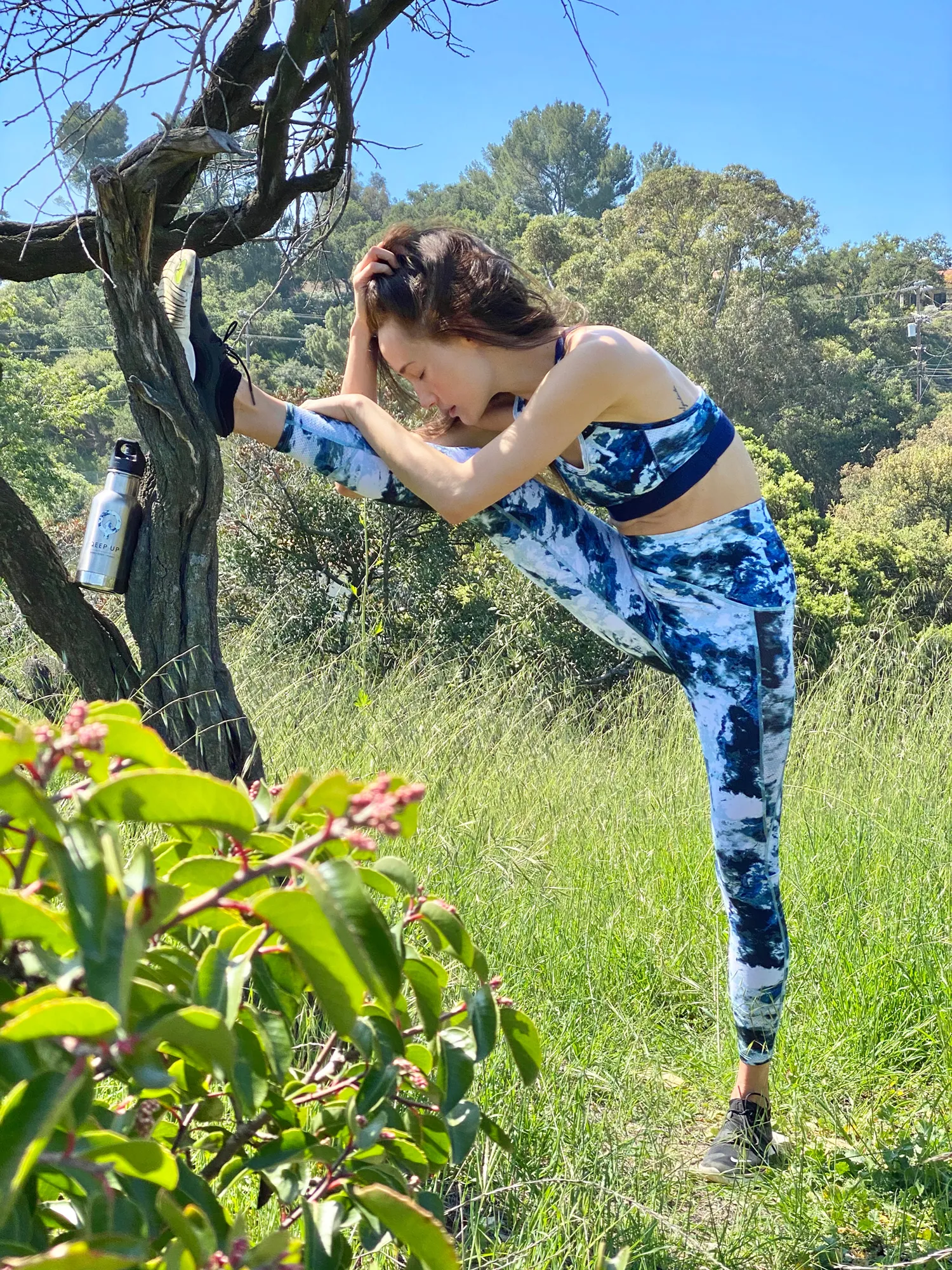 Afterward, Maggie Q stretches out her limbs for a hike. “Stretching is everything,” she explains. “If I don’t do it, I feel my whole body go downhill.”