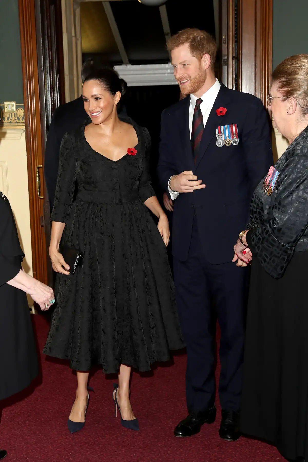 Meghan, 38, and Kate, 37, coordinated their ensembles. The Duchess of Sussex sported a black, tea-length dress with black heels and a simple bun, while the Duchess of Cambridge wore a fitted navy frock with black pumps, black tights and a black headband.
