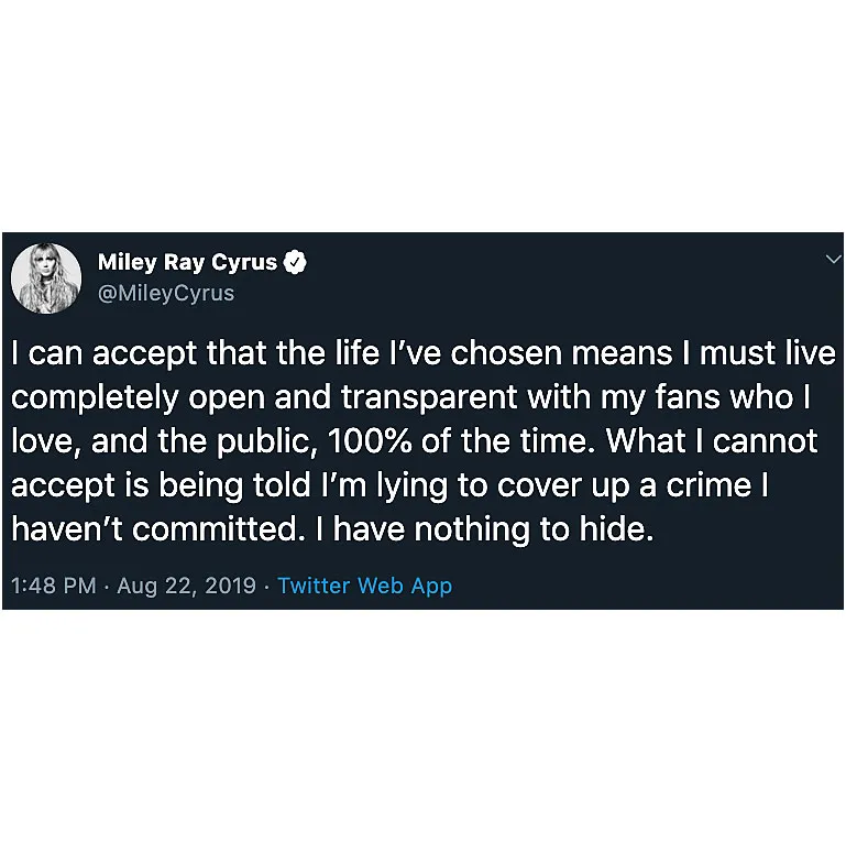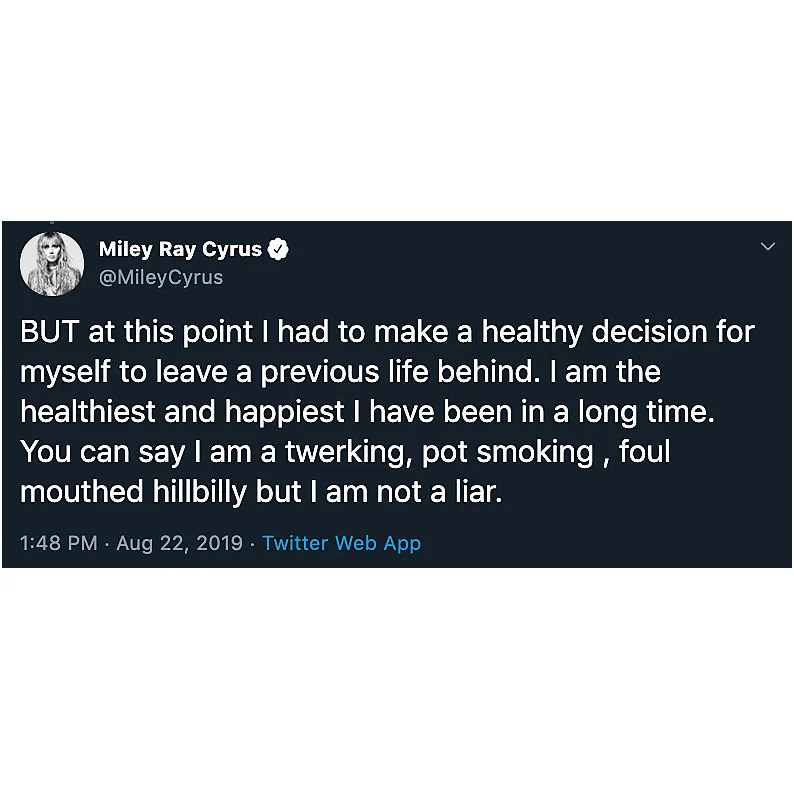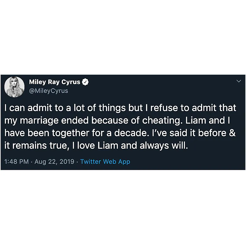 Miley Cyrus is OK with a lot of labels, but don’t call her a cheater. The “Slide Away” singer denied being unfaithful to her estranged husband, Liam Hemsworth, in a lengthy Twitter rant on Thursday, August 22.