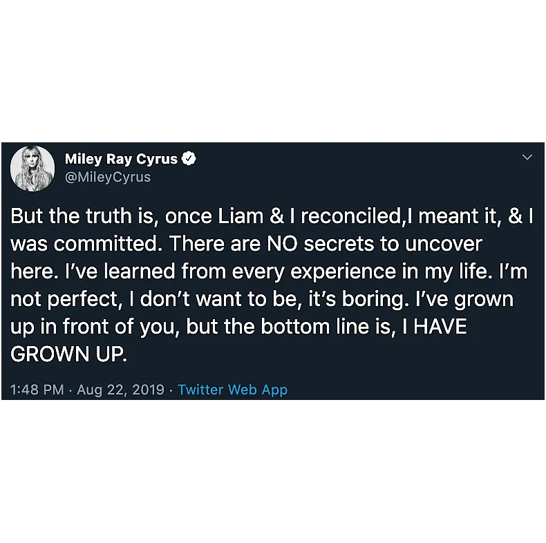 “Once Liam & I reconciled,I meant it, & I was committed. There are NO secrets to uncover here,” she wrote. “I’ve learned from every experience in my life. I’m not perfect, I don’t want to be, it’s boring. I’ve grown up in front of you, but the bottom line is, I HAVE GROWN UP. … I can admit to a lot of things but I refuse to admit that my marriage ended because of cheating.”