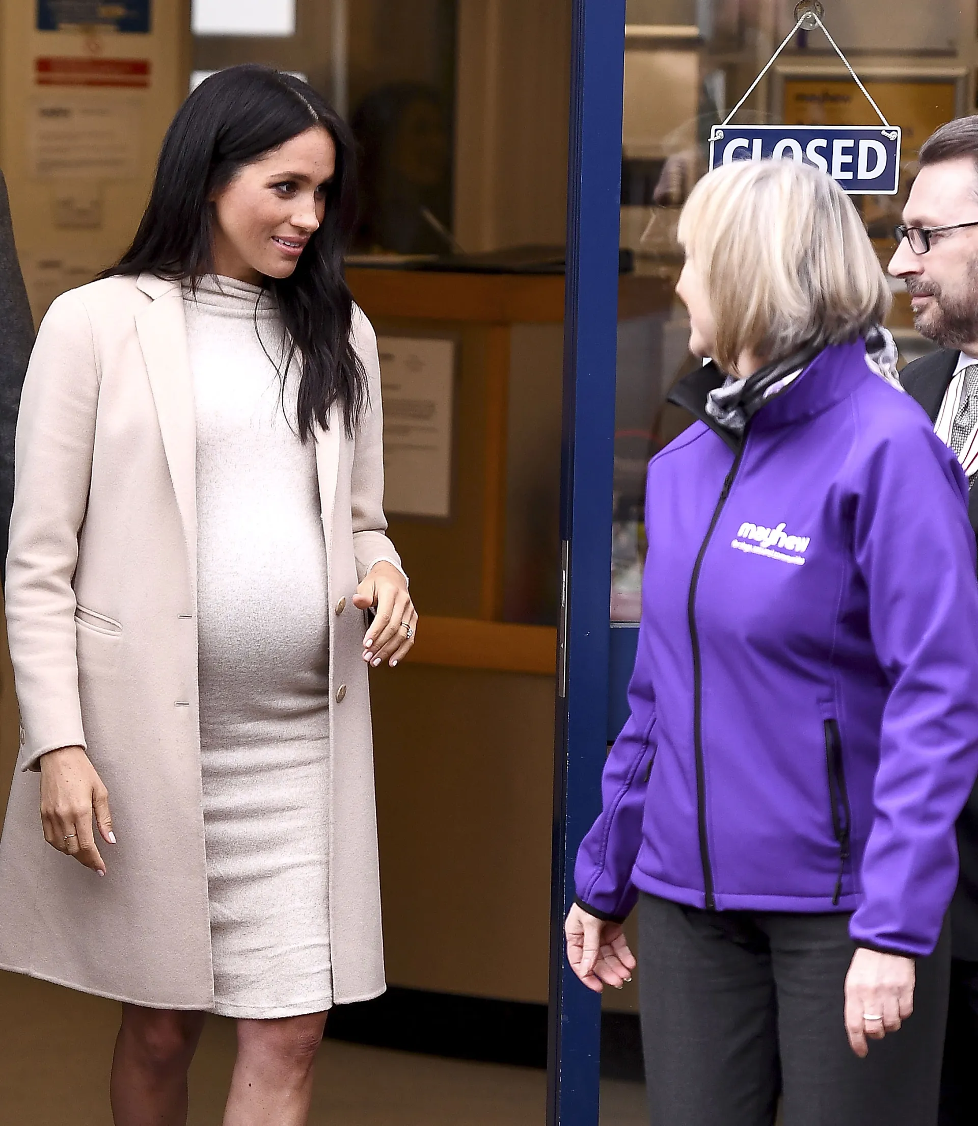 Duchess Meghan has a good sense of humor! The pregnant royal couldn’t help but laugh when a woman lovingly poked fun at her growing baby bump during a visit to the London animal welfare charity Mayhew on Wednesday, January 16.