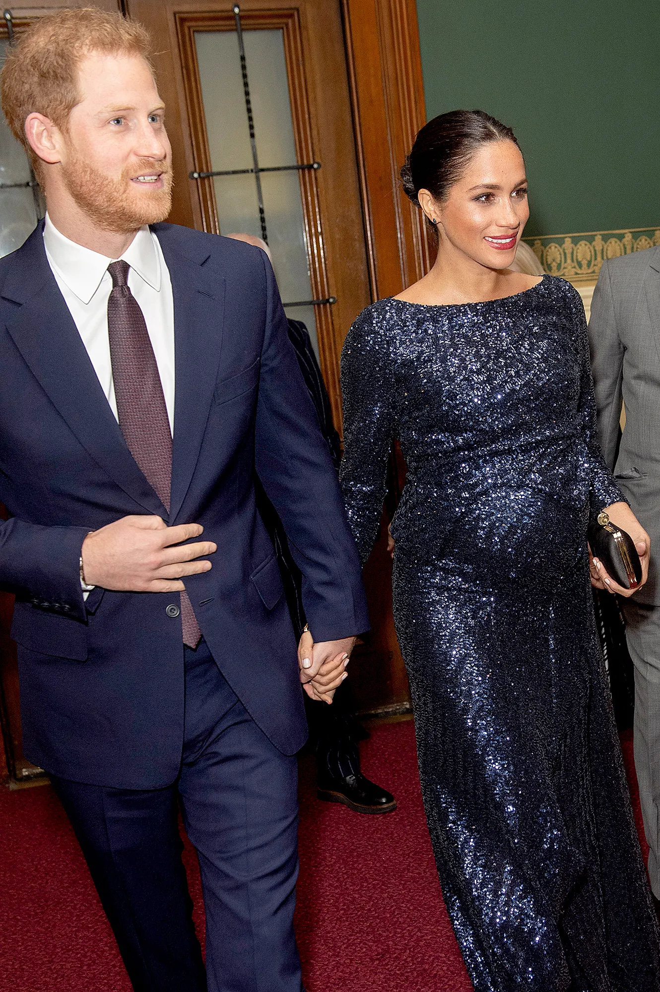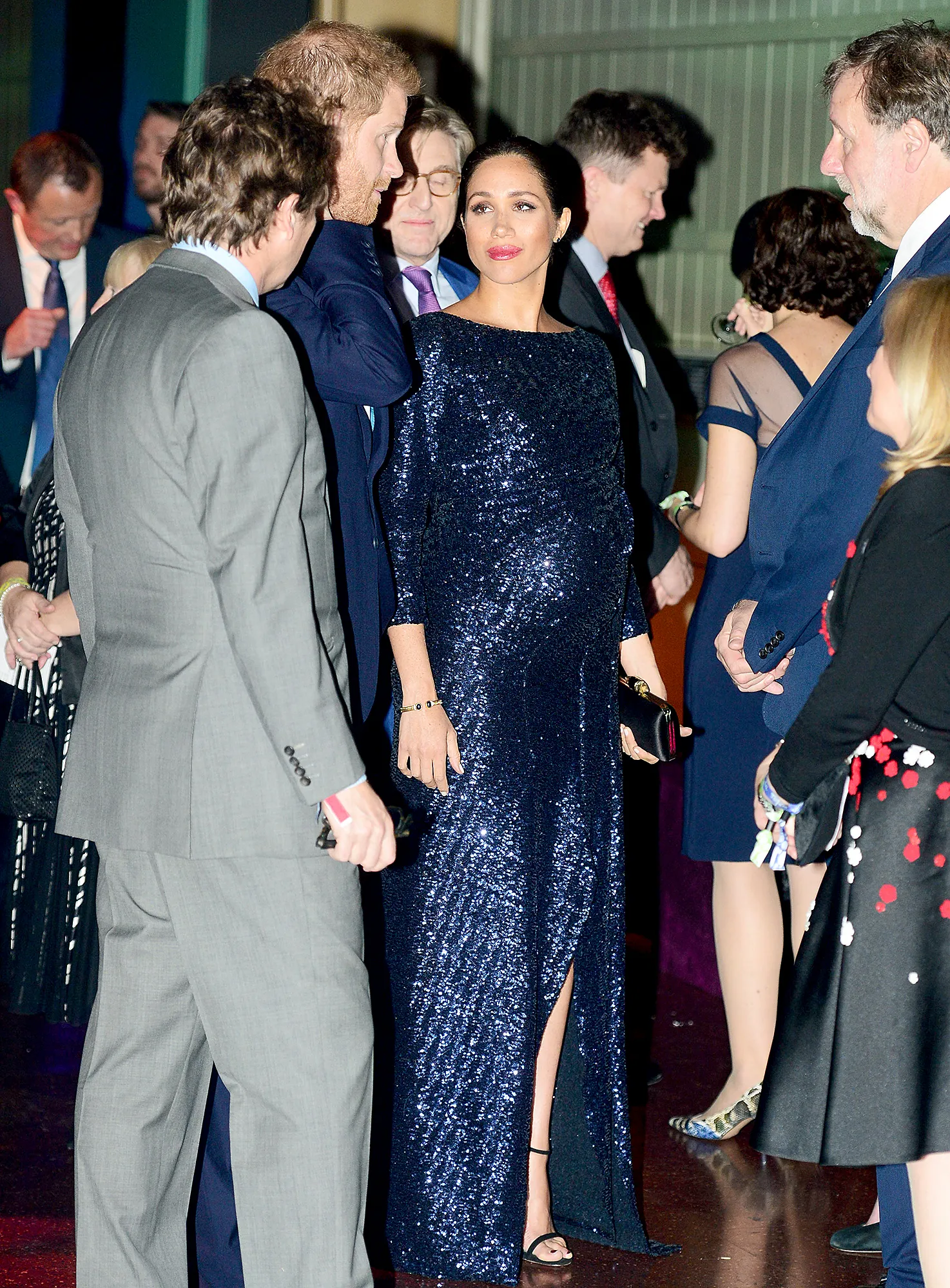 The 37-year-old Suits alum showed off her baby bump in a navy, sparkly gown. The long-sleeve dress was designed by Roland Mouret. Meghan completed her look with red lipstick, black strappy heels and a Givenchy clutch — the same designer who dressed her for her and Harry’s May 2018 nuptials.