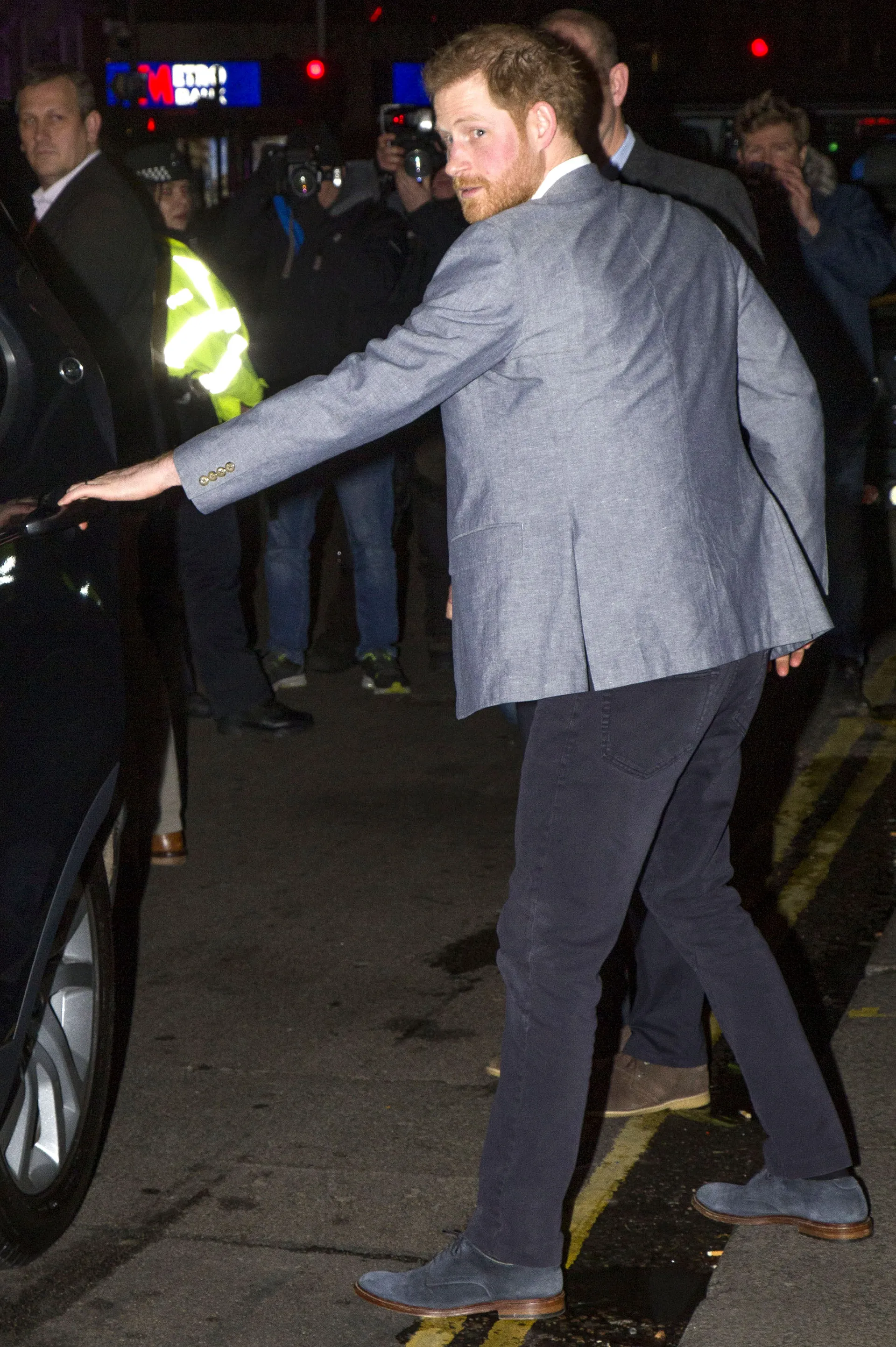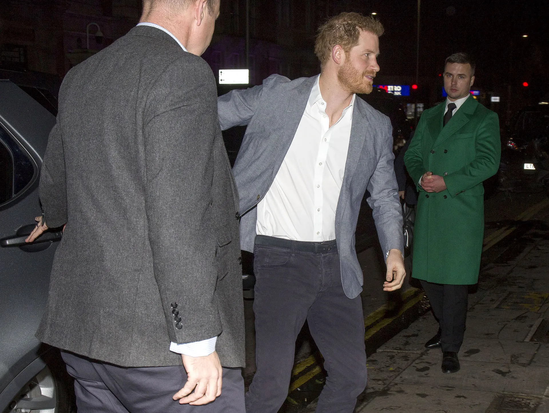 The Duke of Sussex, 35, was addressing guests at a dinner for supporters of his Sentebale charity at The Ivy Chelsea Garden on Sunday, January 19. Harry briefly smiled as he walked into the eaterie wearing charcoal pants, matching suede shoes, a white shirt and gray jacket. He was accompanied by good friend Mark Dyer and a group of bodyguards.