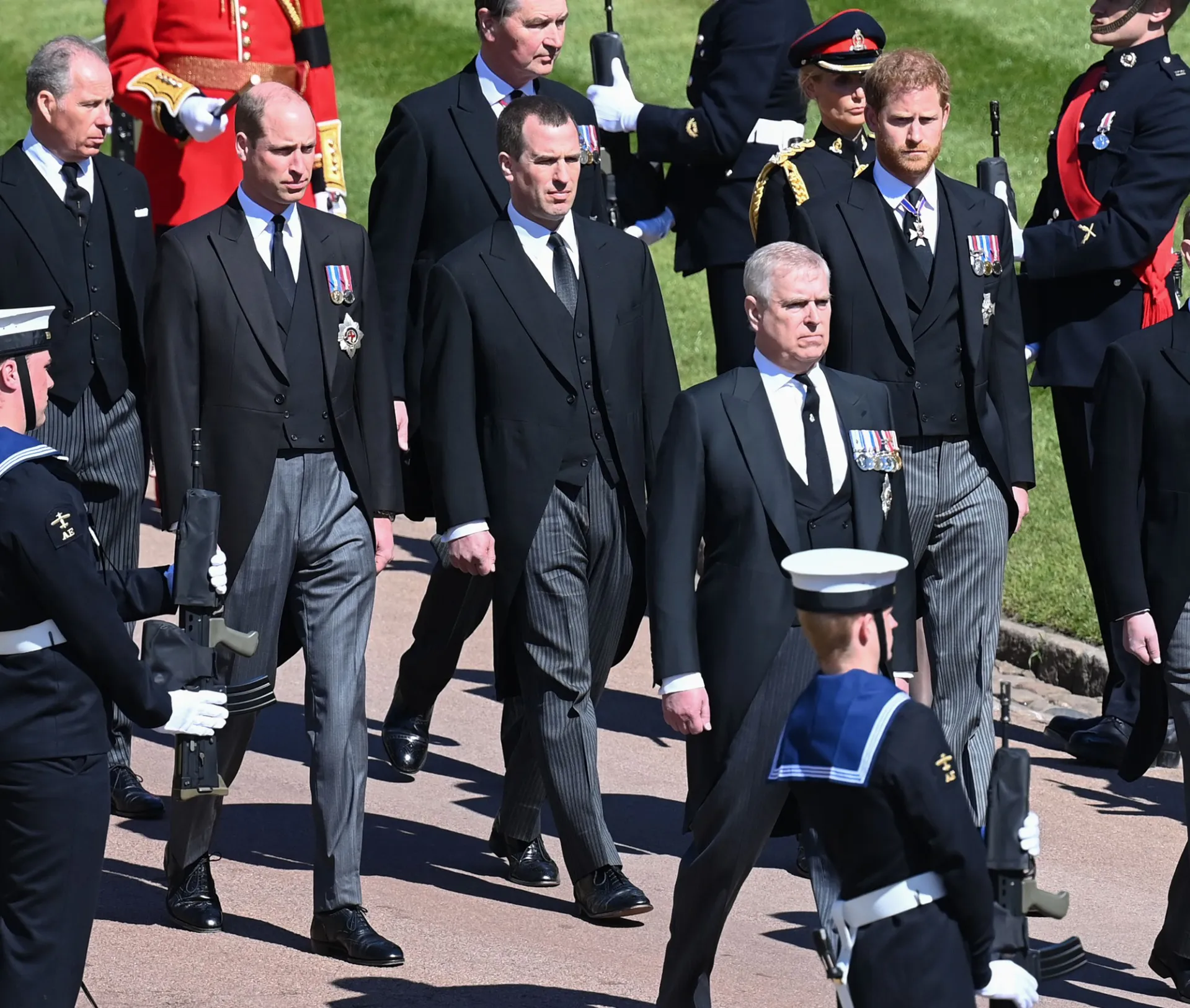 Coming together for their grandfather. Prince Harry and Prince William were among the royal family members chosen to walk behind Prince Philip‘s casket on Saturday, April 17, as the family exited Windsor Castle ahead of the funeral.