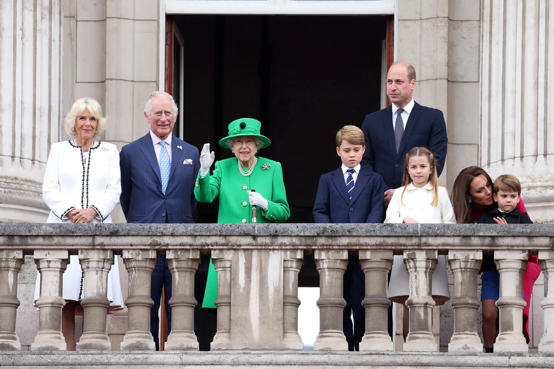 The sovereign, 96, was photographed waving to the crowd of well-wishers on Sunday, June 5, shortly after the Jubilee Pageant concluded. She wore a bright green dress, matching hat and a set of pearls. Prince Charles, Duchess Camilla, Prince William and Duchess Kate joined the queen on the balcony, smiling wide. The Duke of Cambridge, 39, and the Duchess of Cambridge, 40, also brought their three children: Prince George, 8, Princess Charlotte, 7, and Prince Louis, 4.