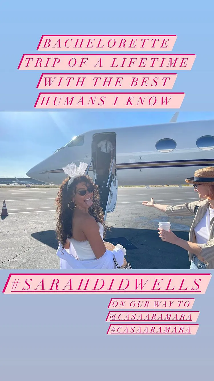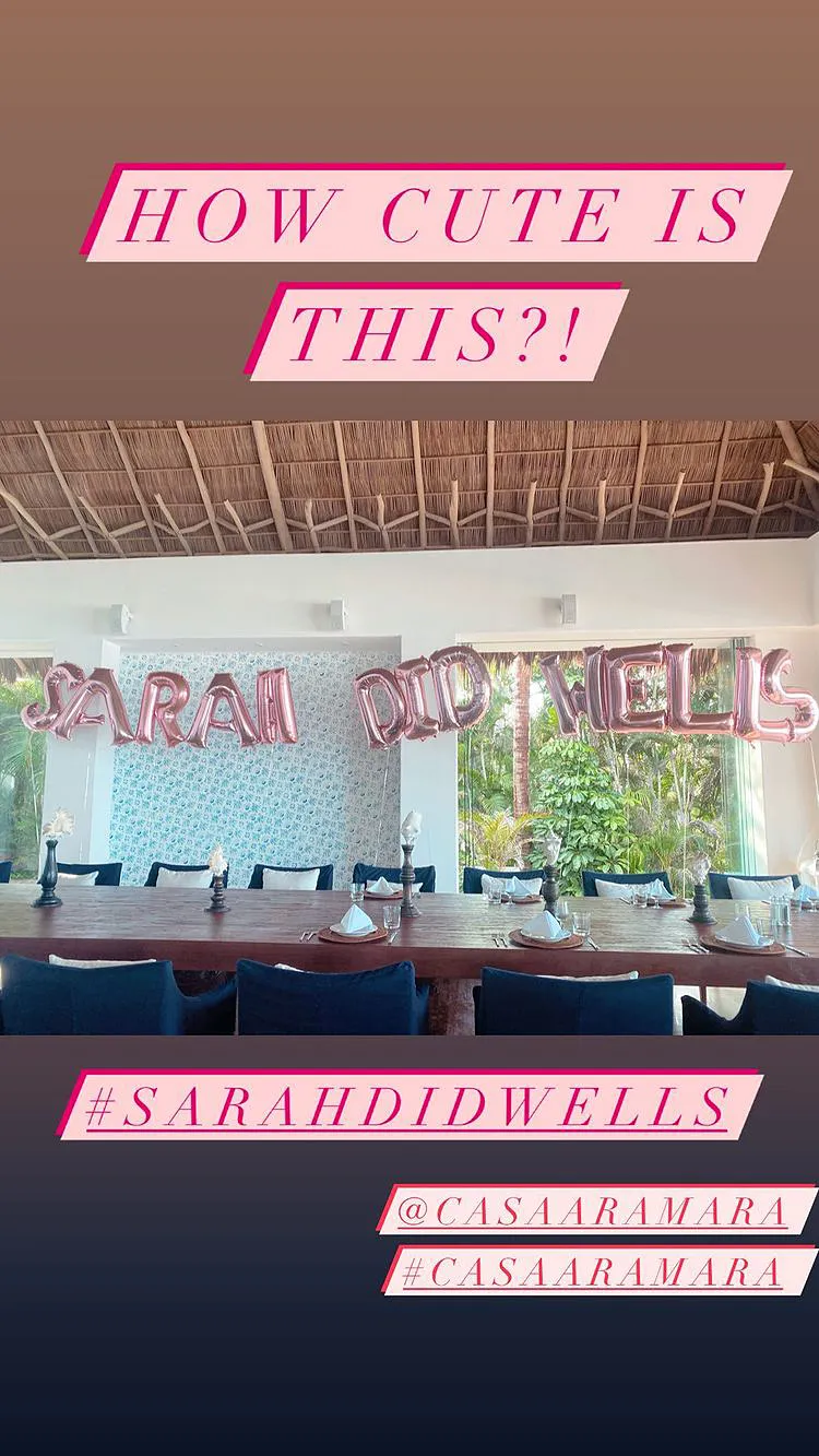 The Geek Charming and her friends celebrated at the Casa Aramara resort in Mexico. “How cute is this?!” the actress wrote in an Instagram Story, showing off a display of large pink balloons that spelled out “Sarah Did Wells.” The pun appears to be the couple’s official wedding hashtag.