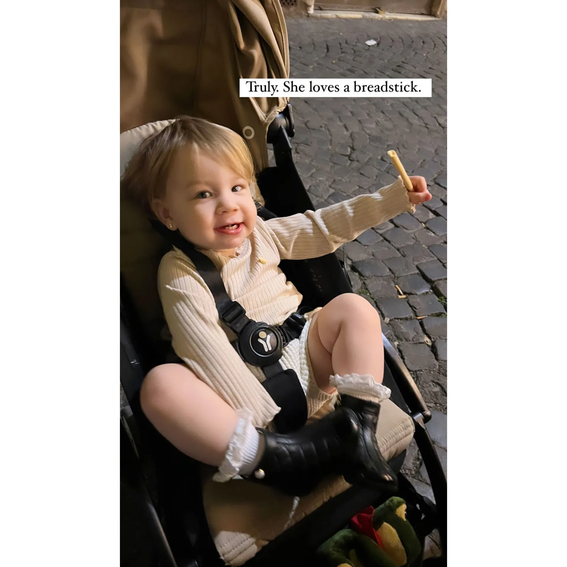 “Living her best life,” Schroeder wrote via social media on Monday, showing her baby girl smiling while snacking in the city. “Truly, she loves a breadstick.”