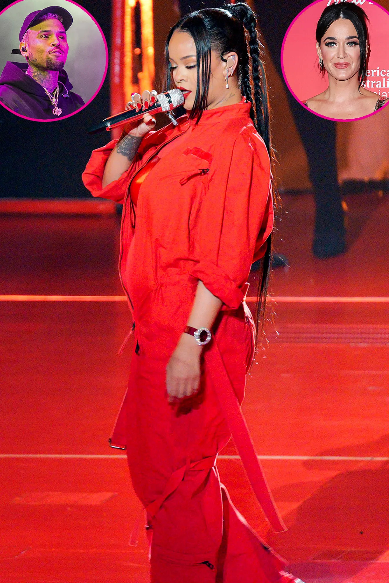Rihanna, 34, sang a medley of her hits at State Farm Stadium in Glendale, Arizona on Sunday, February 12. The “Umbrella” singer donned a red jumpsuit while belting out some of her most popular songs including “Diamonds” and “Bitch Better Have My Money.”