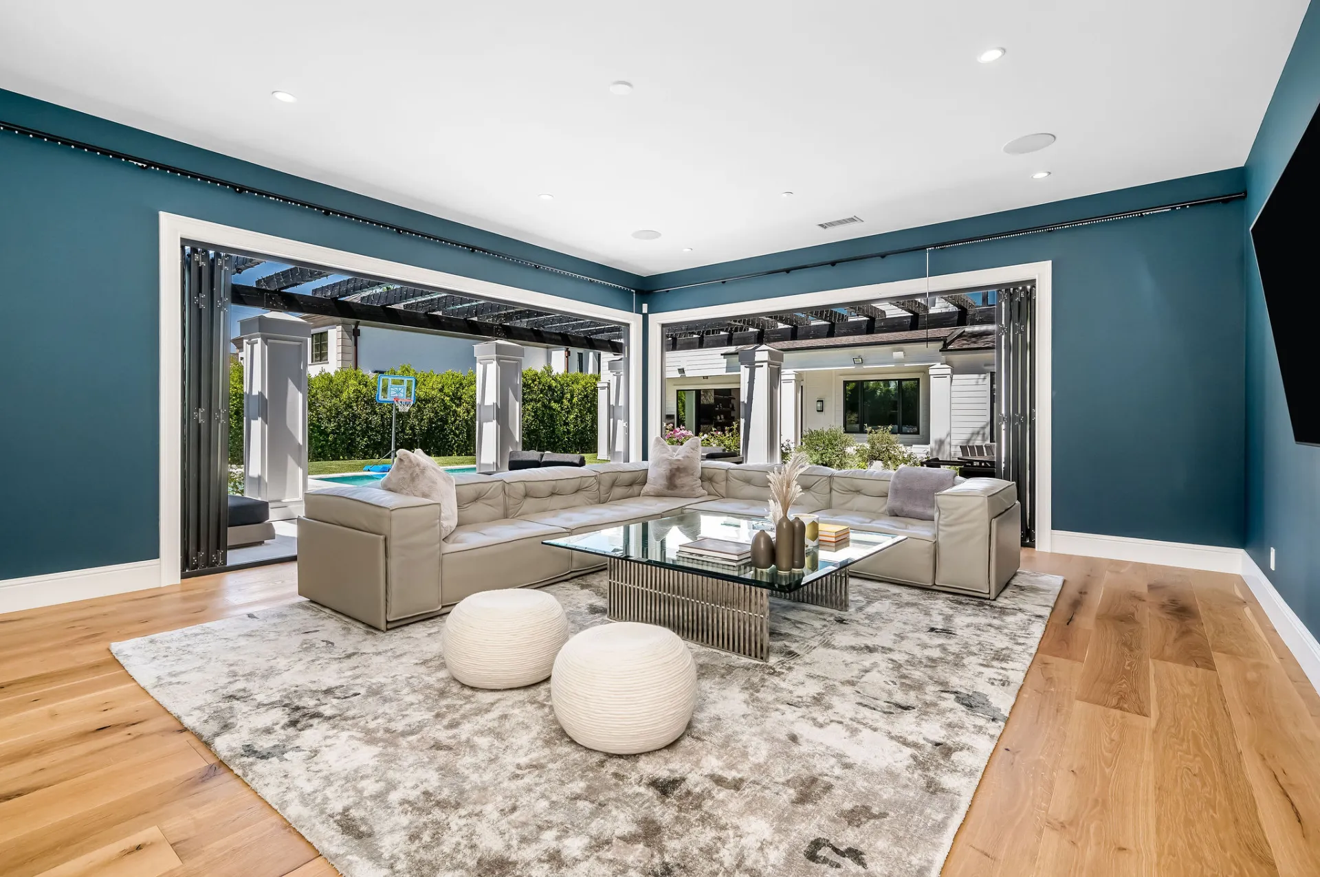 The amenities include a bar, a wine cellar, his-and-hers closets, a swimming pool and a fire pit. It also has a 1,580-square-foot guest house with two bedrooms, one bathroom, a family room and a kitchenette.
