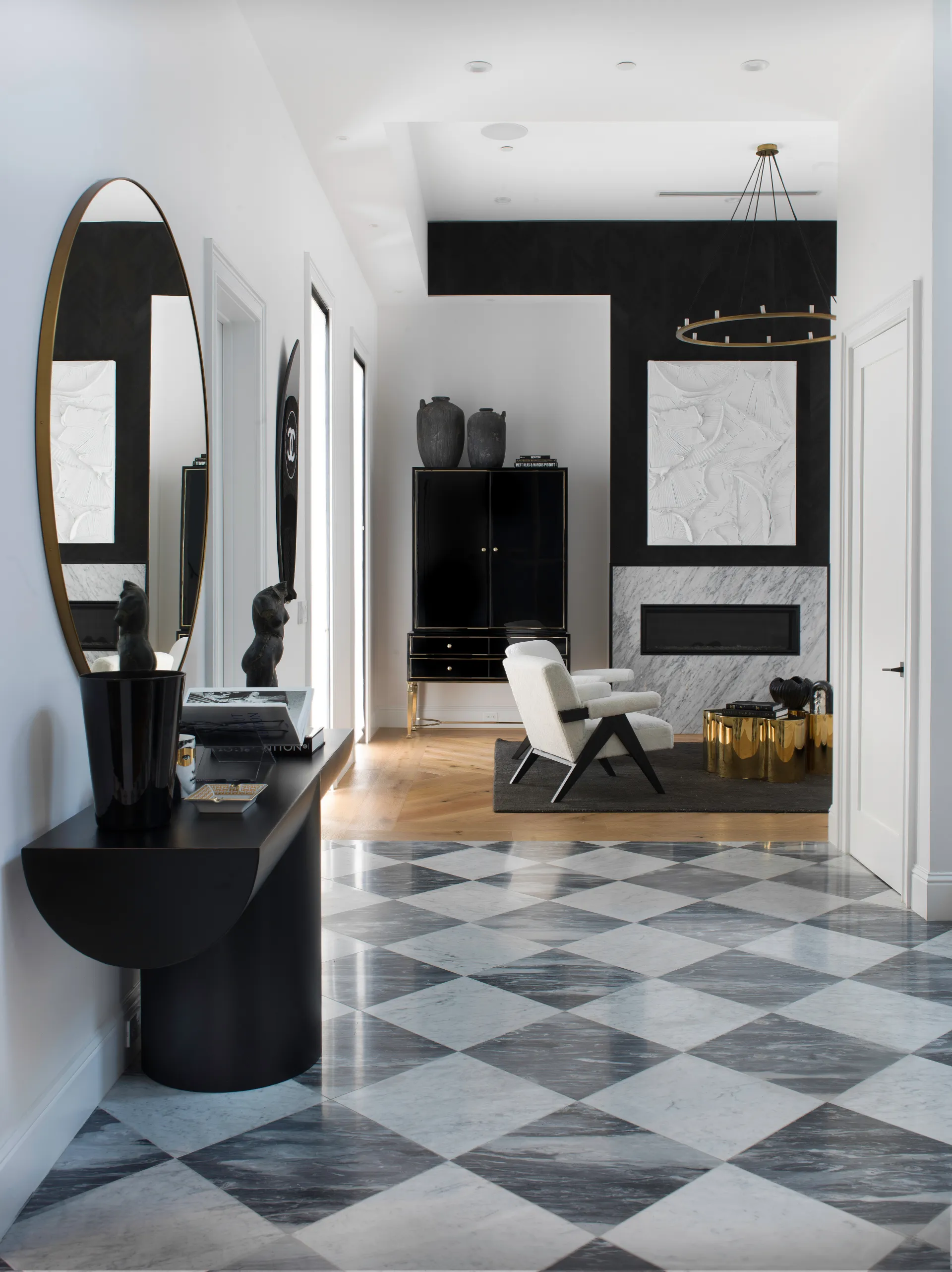 The main house features a grand entry with vaulted ceilings and checkered marble tile, a fireplace in the living room, two kitchens with stone islands and top-end appliances, a breakfast nook and a private patio.