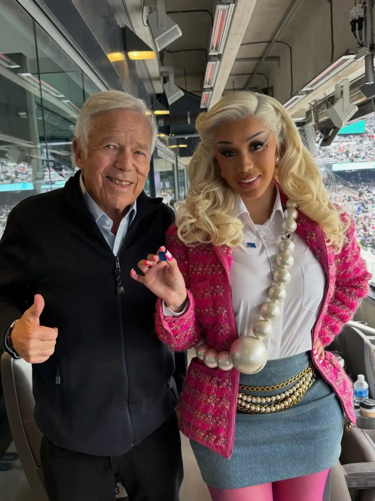 Cardi, de 33 años, posó para una foto con Kraft, de 84 años, durante la victoria por 42-10, luciendo un atuendo que aseguró que se volvería viral.