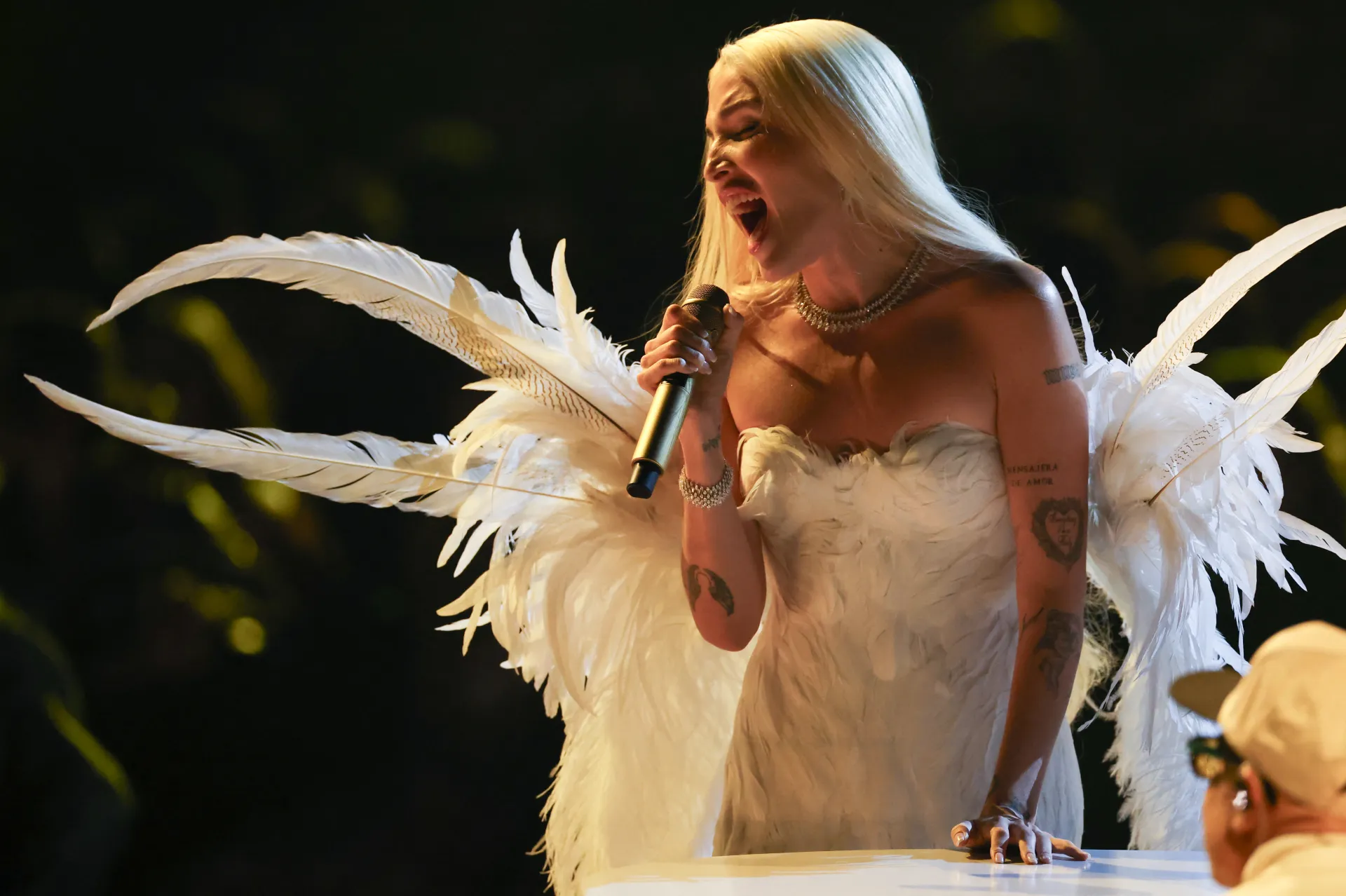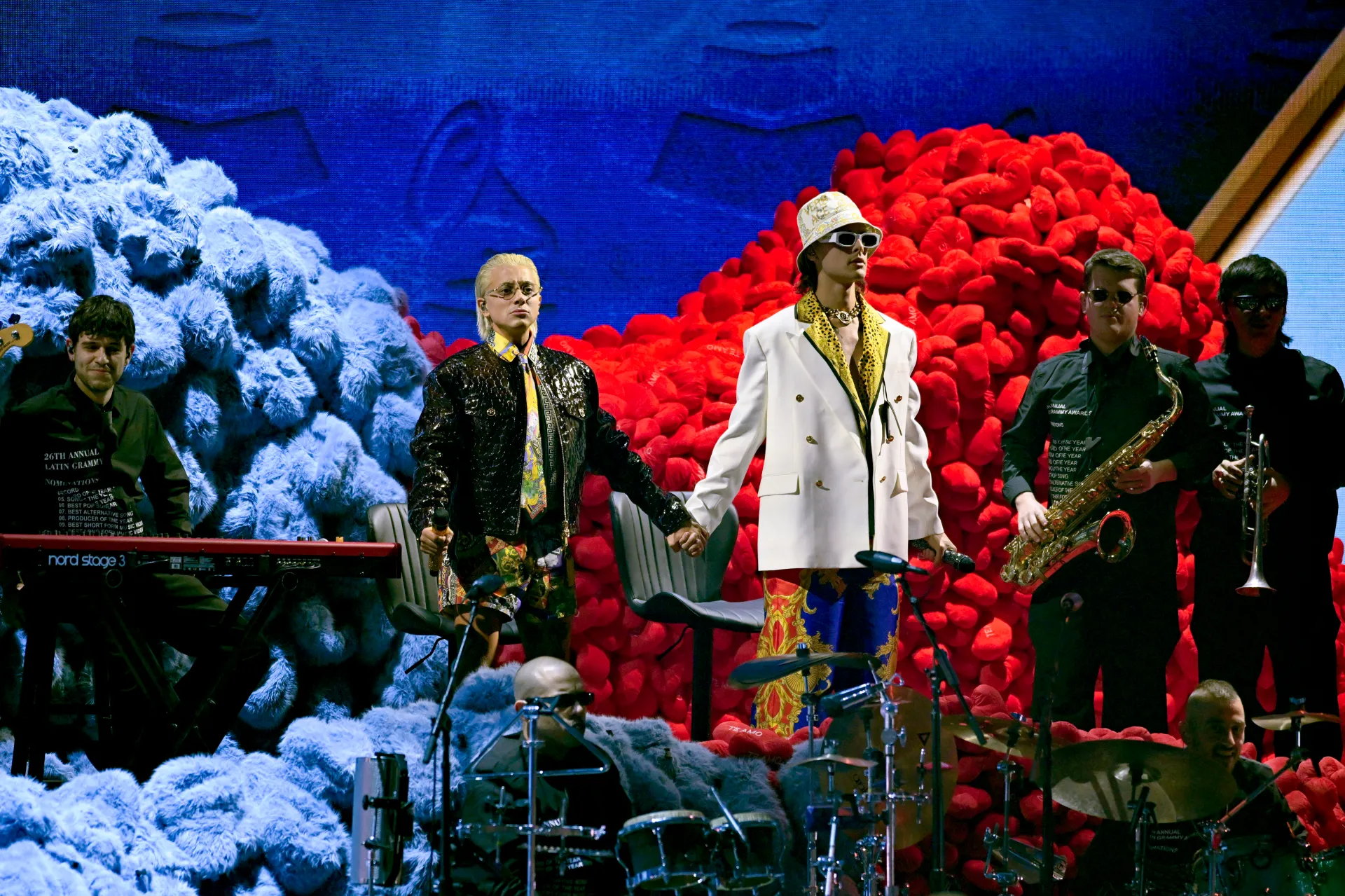 La noche inició por todo lo alto: una presentación del icónico guitarrista Carlos Santana, que a sus 78 años demuestra que las cuerdas siguen perfectamente afinadas. El cantante colombiano Maluma abrió la ceremonia y soltó la frase “honor a quien honor merece”. Poco después entró el mexicano Christian Nodal y cerró Grupo Frontera.