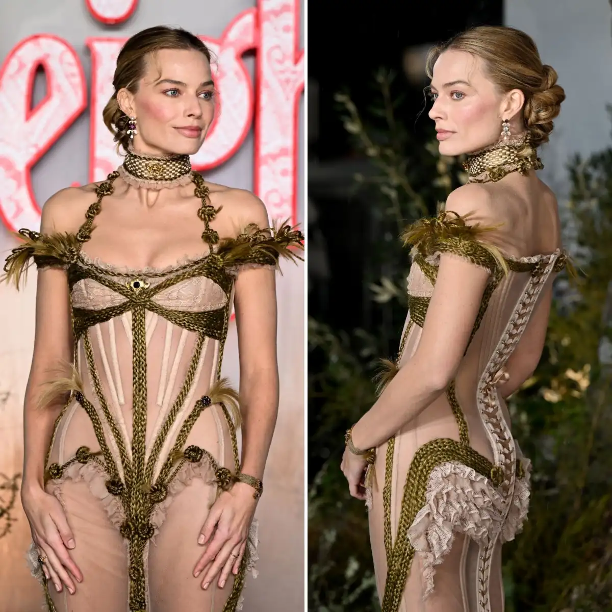 De lado y por detrás, el vestido largo hasta el suelo que vestía Robbie revelaba su detalle más llamativo: una columna vertebral al descubierto, perfilada con un cordón de cabello tejido, acabado en un remate texturizado y deshilachado en la parte baja de la espalda.