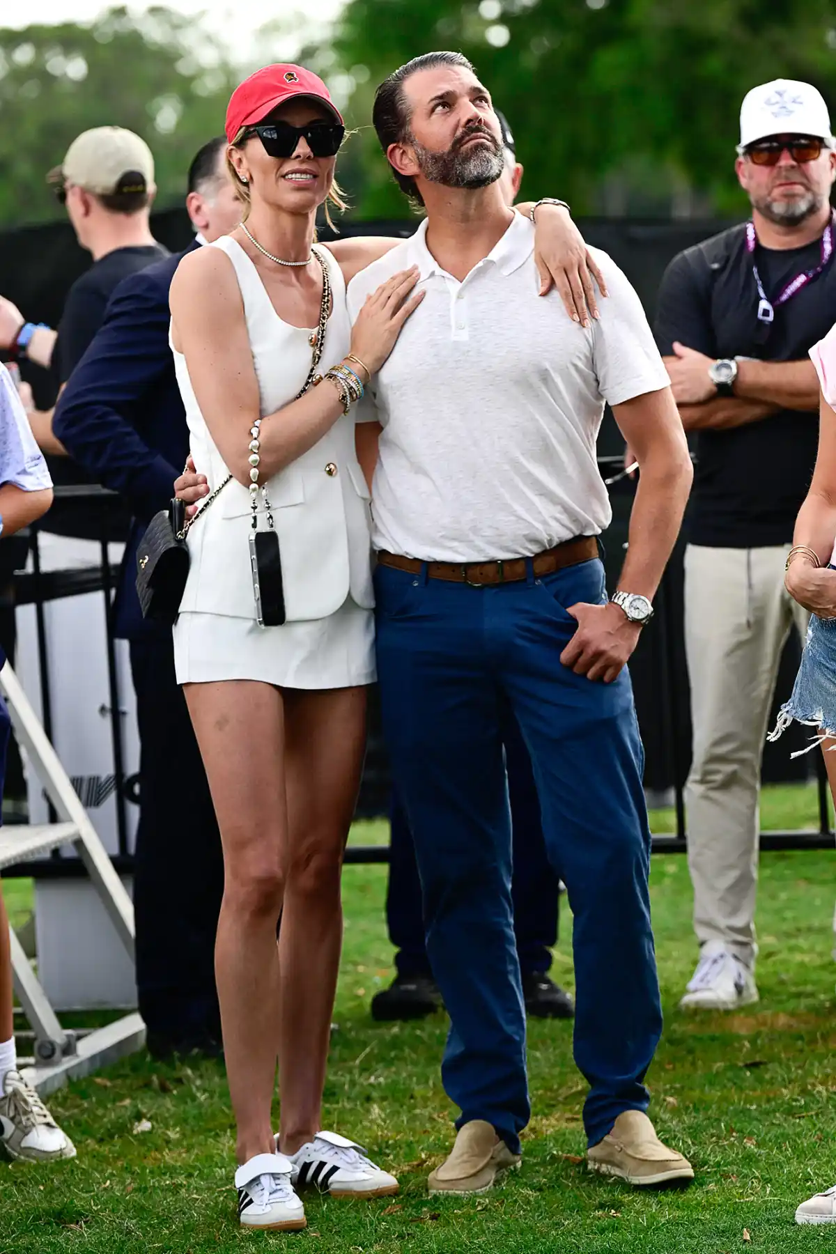 A Trump, de 47 años, se le vio acurrucándose con su novia, Bettina Anderson, en el concierto de Sublime durante LIV Golf Miami en Trump National Doral el sábado 5 de abril, en Florida. La pareja tenía los brazos entrelazados mientras reían y charlaban: Trump con una camiseta polo blanca y pantalones azules, y Anderson, de 37, con un conjunto de falda-camisa corta blanca, sombrero rojo, gafas de sol y zapatillas. También llevaba un bolso de cruzar negro.