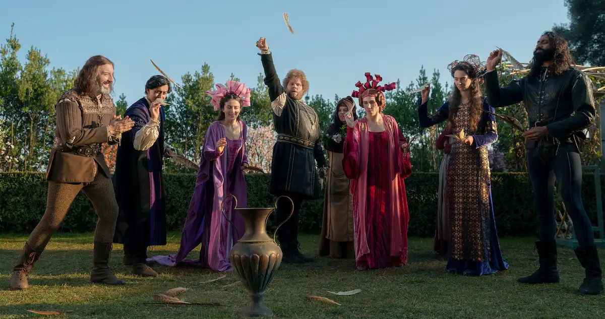 There’s also raunchy humor as the various inhabitants of the villa begin switching romantic partners faster than musical chairs. The upstairs/downstairs stories of the villa staff showcase the show’s smart social satire as cook Stratilia (Leila Farzad) and Sirisco chafe at the increasingly absurd demands of the nobles. And there are farcical, over-the-top scenarios reminiscent of What We Do in the Shadows, like when the group tries to distract and mislead a group of marauding monks.