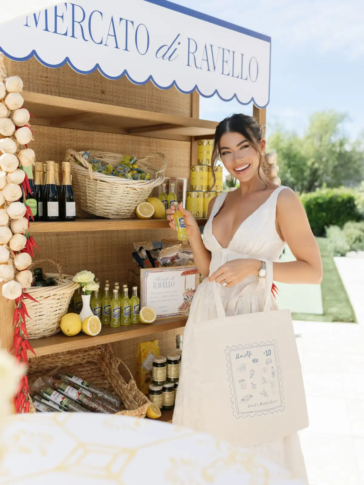 “My goal was to feel like we were transported to the Amalfi Coast for an afternoon,” Trott exclusively told Us about her bridal shower, which was planned and designed with the help of Maison Glasco. “From the hanging bougainvillea, the limoncello spritzes and the Italian market with draped garlic and chilies, this was all about authentic nods to the perfect Italian summer.”