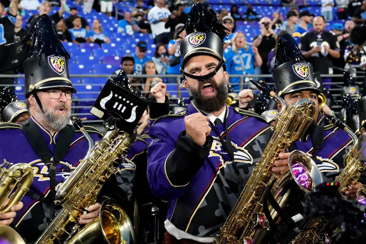 While cameras rolled during the pregame broadcast, Kelce, 37, accompanied the Ravens’ marching band on a jaunty rendition of the Monday Night Football song. He sported a purple uniform and black hat, with the chin strap grazing his nose. When the song ended, he cheered and high-fived band members.