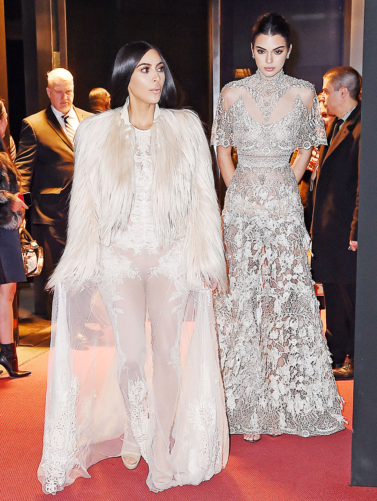 The Selfish author, 36, chose the heist comedy as one of her first projects since her hiatus following her own Paris robbery in October. The sisters were photographed shooting a scene at a fictional Met Gala, where they walked the red carpet in similar white gowns. Kardashian chose a sheer, lace dress, which she topped with a white fur coat, while her supermodel sister, 21, donned an Elie Saab lace number.