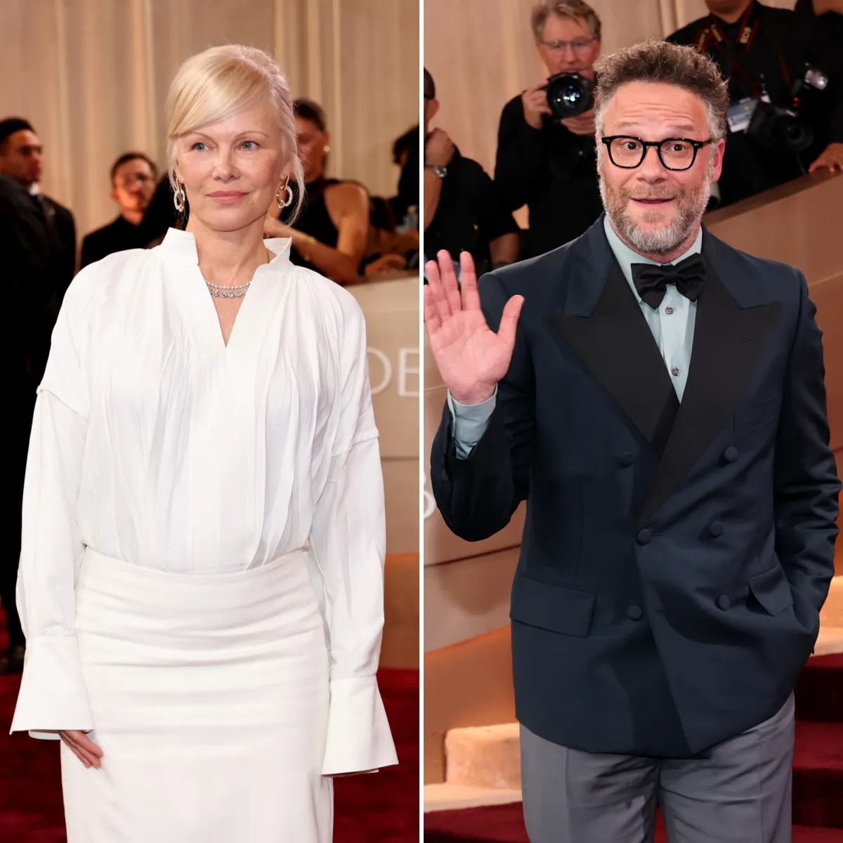 Pamela Anderson ran into Seth Rogen, who famously starred on the Hulu series inspired by the actress’ one-time marriage to Tommy Lee, at the 2026 Golden Globes.