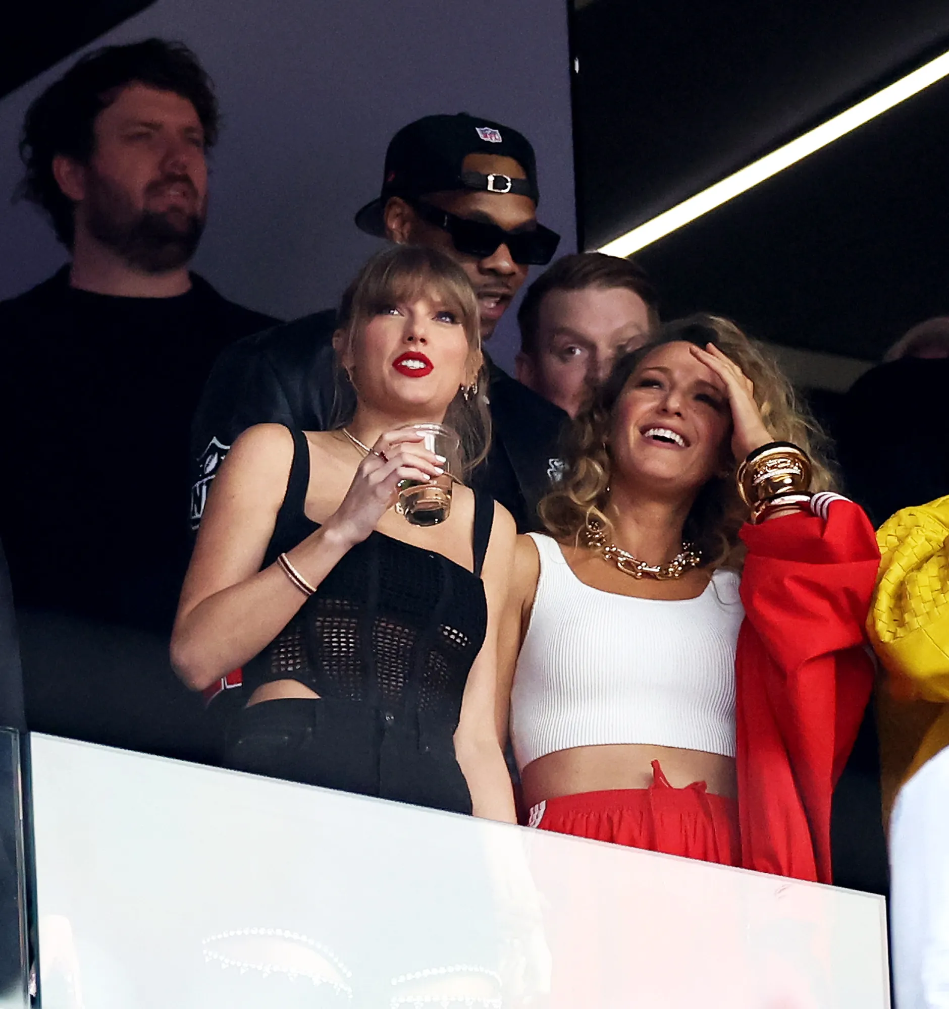 Swift, 34, arrived alongside close friend Blake Lively to watch the tight end, also 34, compete in the championship game at Allegiant Stadium in Las Vegas on Sunday, February 11. She wore a black corset top with matching jeans and had her hair pulled back in a high ponytail. She arrived carrying a red jacket over her shoulder. Lively, 36, wore a white crop top with a red track jacket.