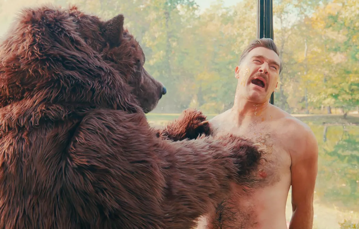 The theory is that Swift is the one in the bear costume during that scene where Bad Bunny’s character, Oscar, slathers a shirtless Kelce with honey as the NFL star is attacked by a bear.