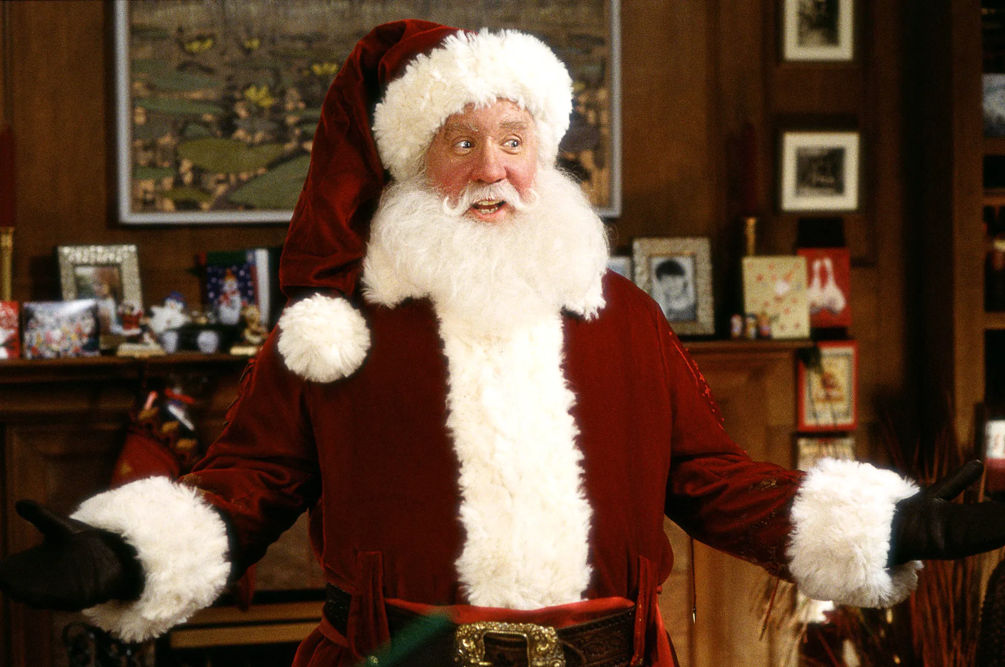 Allen originally played businessman Scott Calvin in 1994’s The Santa Clause. In the holiday classic, Santa falls off the Calvin family’s roof and Scott puts on his magical suit at the request of his son, Charlie (Eric Lloyd), transforming into the white-bearded man.