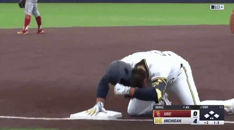The celebration was part of a banner day for Voit, who finished 3-for-3 with 4 RBIs, three runs and a walk against the Trojans. Michigan defeated USC 11-0 to salvage a game after losing the first two in the series.