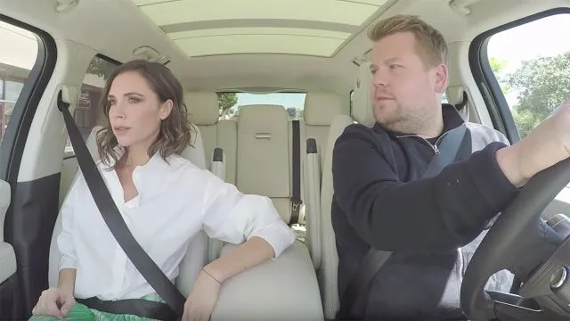 When Beckham tells Corden that she wants to be with her own kind, he makes a run for it with her tucked under his arm, and that’s where the carpool karaoke begins.