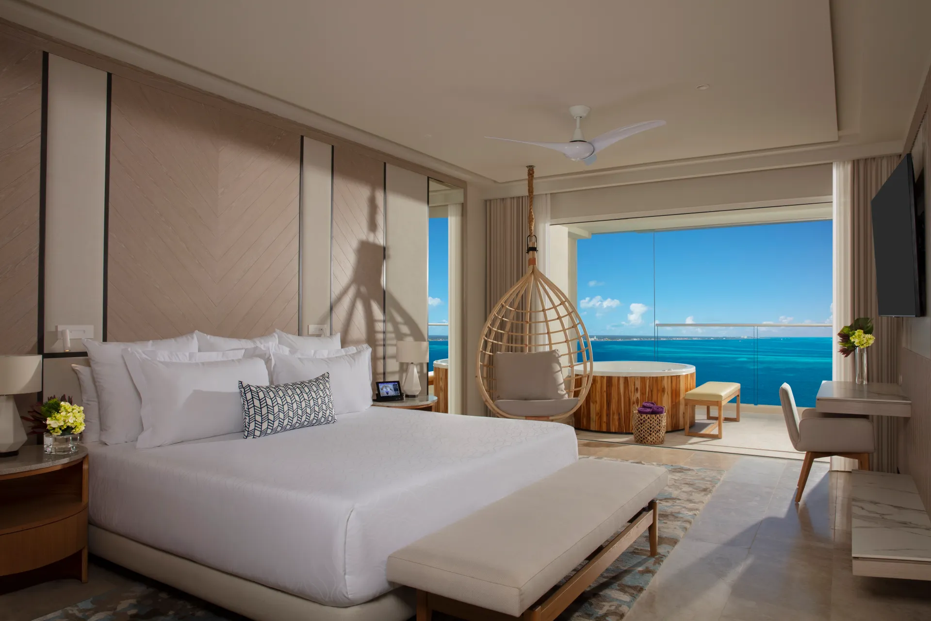 For a vacation like no other, guests can take it a step further and stay like a VIP with an upgraded experience in the Xhale club suites. The club suites are designed for those guests who enjoy the finer things, seeking the highest level of luxury for their vacation. The club offers exclusive perks like personalized pampering that includes check-in and check-out with concierge, private lounges with a daily continental breakfast, a dedicated rooftop and infinity pool with views of the Cancun skyline, ocean and lagoon, enhanced room amenities, and upgraded suites.