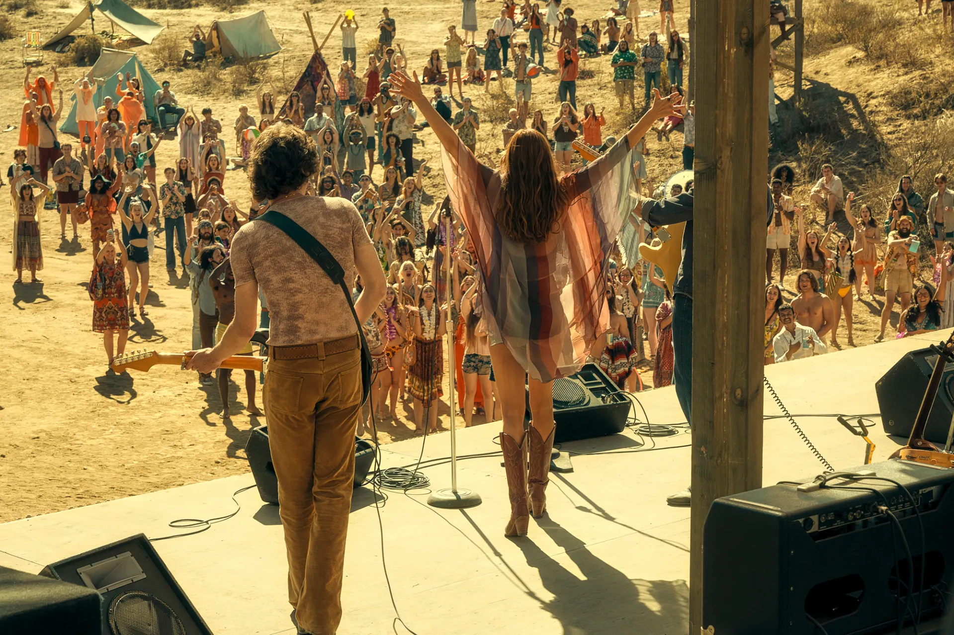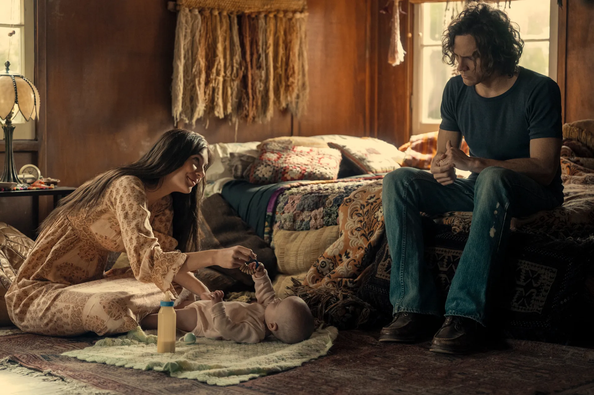 Neustadter still had the challenge, however, of figuring out what worked best for TV —and that meant expanding certain characters’ stories while cutting others out completely. In one of the biggest changes from the novel, The Six’s bassist, Pete, is erased entirely, with the band always having five members (plus Camila, portrayed by Camila Morrone, Billy’s girlfriend and eventual wife).