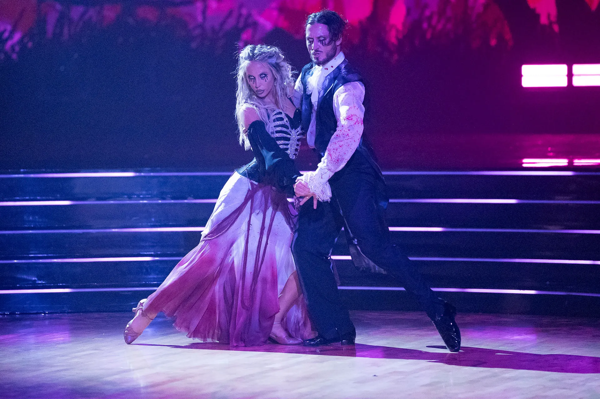 Halloween Night also brought The Dance Monsterthon to the ballroom, which replicates “an actual ballroom competition,” with everyone performing the same type of dance at the same time until they get tapped out. The last couple standing — Whitney Leavitt and Mark Ballas — received five extra points to their score.
