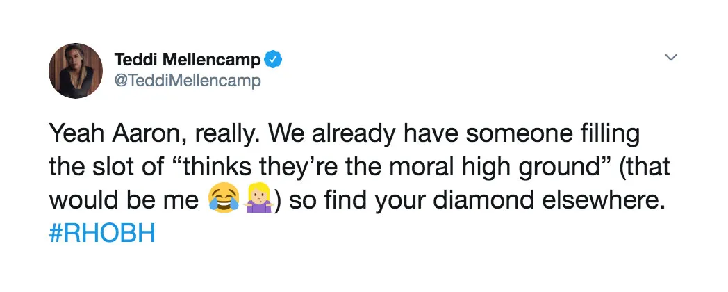 The Real Housewives of Beverly Hills airs on Bravo Wednesdays at 9 p.m. ET. Scroll through for more reactions from the episode, including Teddi’s words for Aaron: