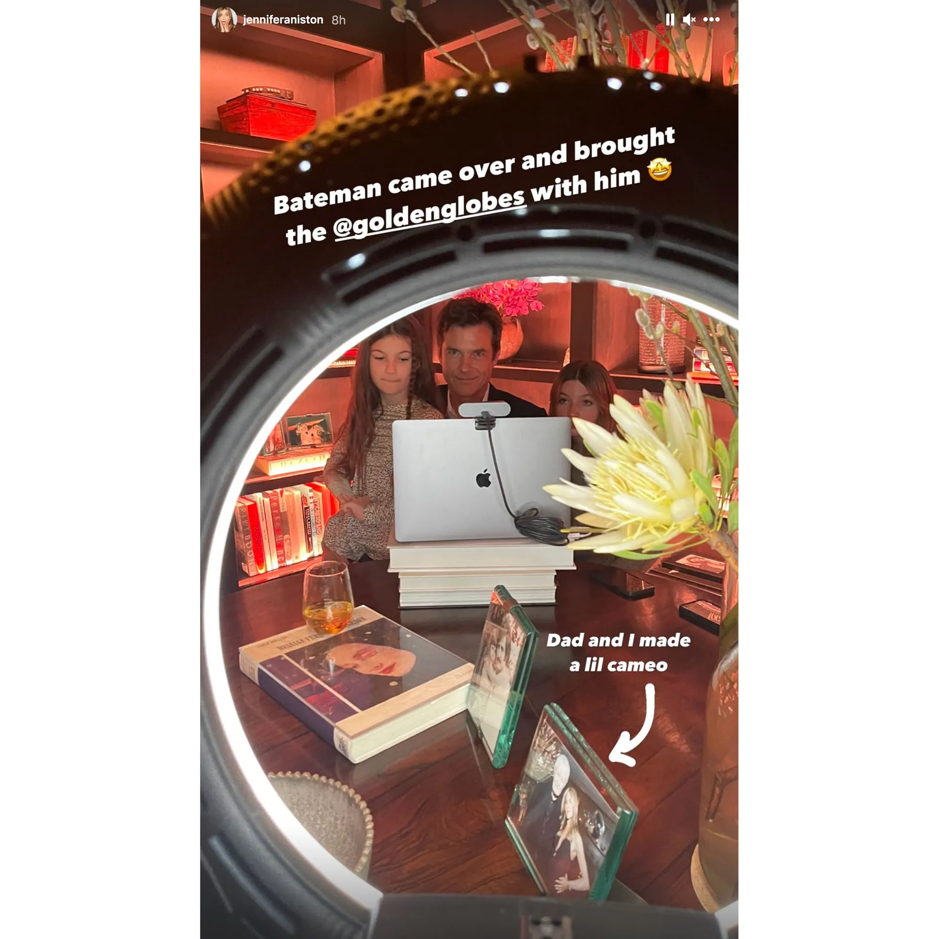 “Bateman came over and brought the @goldenglobes with him,” Aniston captioned one snap of the actor, also 52, sitting with his daughters, Francesca, 14, and Maple, 9, whom he shares with his wife, Amanda Anka.