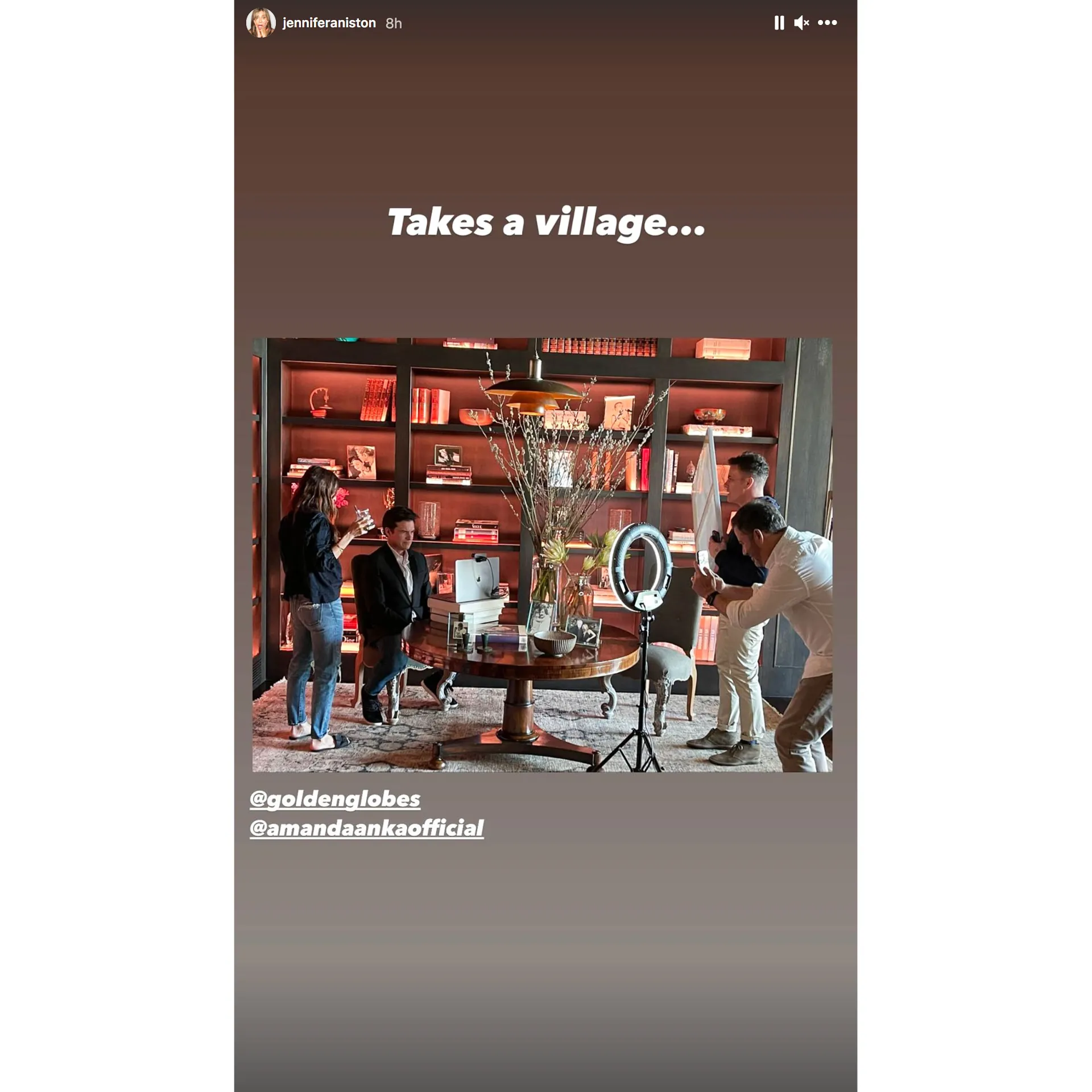 The Morning Show star later gave fans a better look at how Bateman looked so picture-perfect on camera, joking that it “takes a village.” She uploaded a picture of him sitting in front of a laptop propped up on a pile of books as Anka, 52, stood nearby with a drink in hand while two men set up a ring light and a reflector.