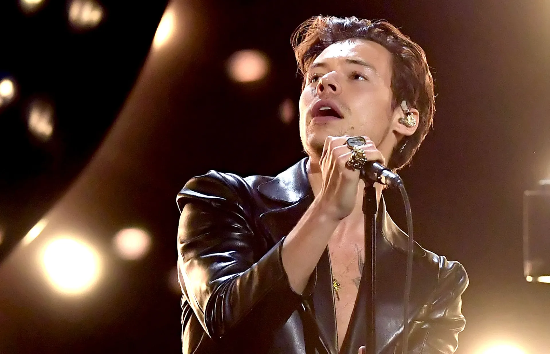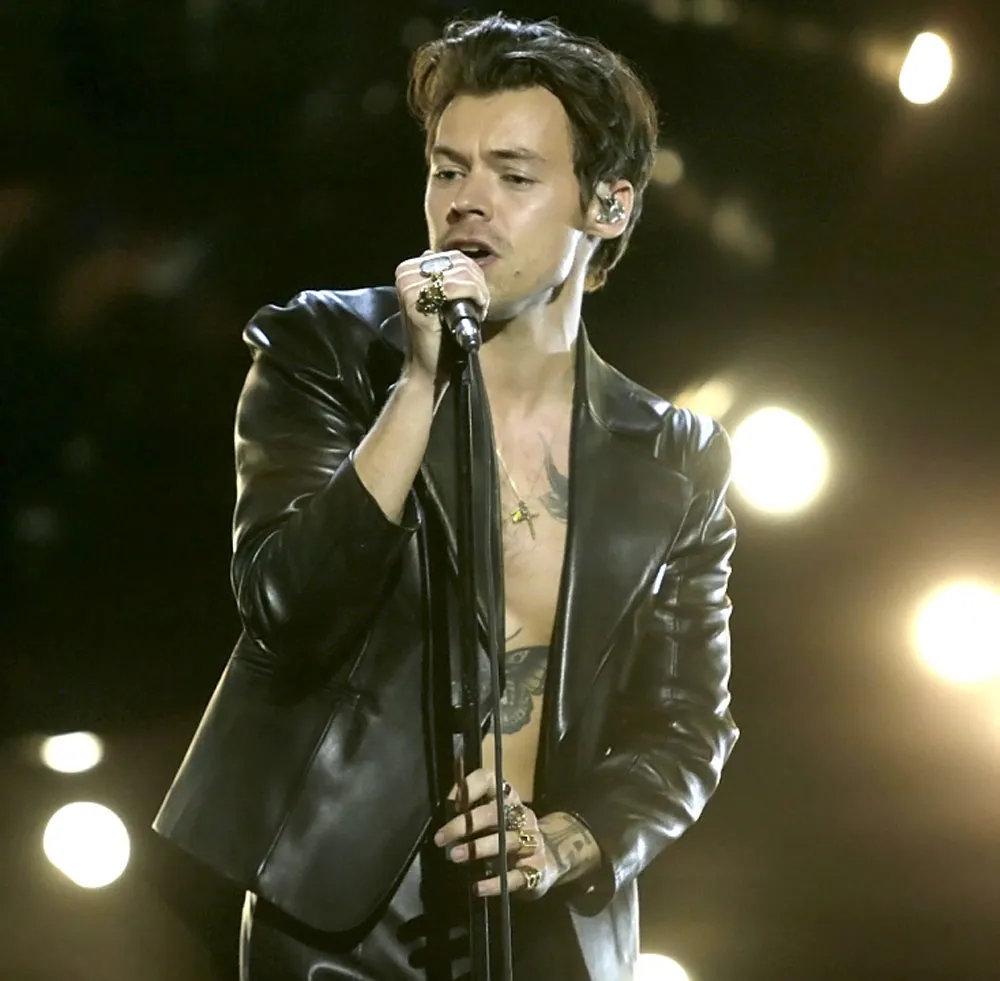 Styles, 27, rocked black leather pants and a matching cropped jacket for Sunday’s show. While he completed his look with a green feather boa, viewers went wild when he took the accessory off and revealed he didn’t have a shirt on under his jacket.