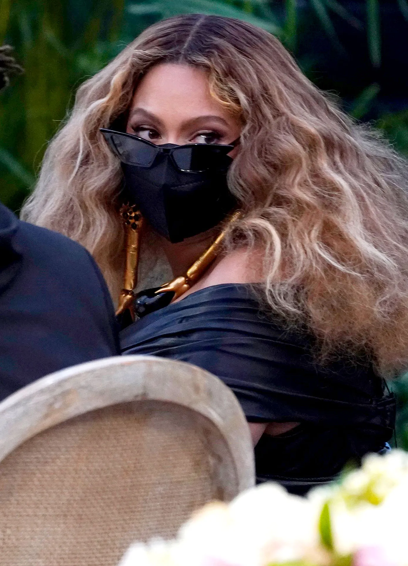 The “Lemonade” singer, 39, matched her sunglasses and face mask to her black gown. Her husband, 51, wore a similar face covering to match his black suit.