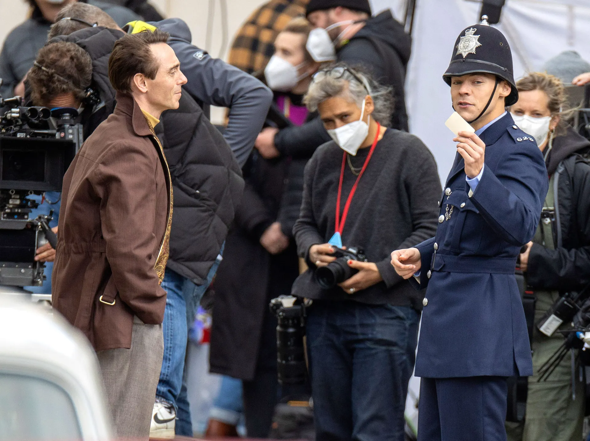 In another set of photos, taken on Tuesday, May 4, the “Adore You” artist was dressed in a period-appropriate policeman’s uniform, complete with a chinstrap hat.