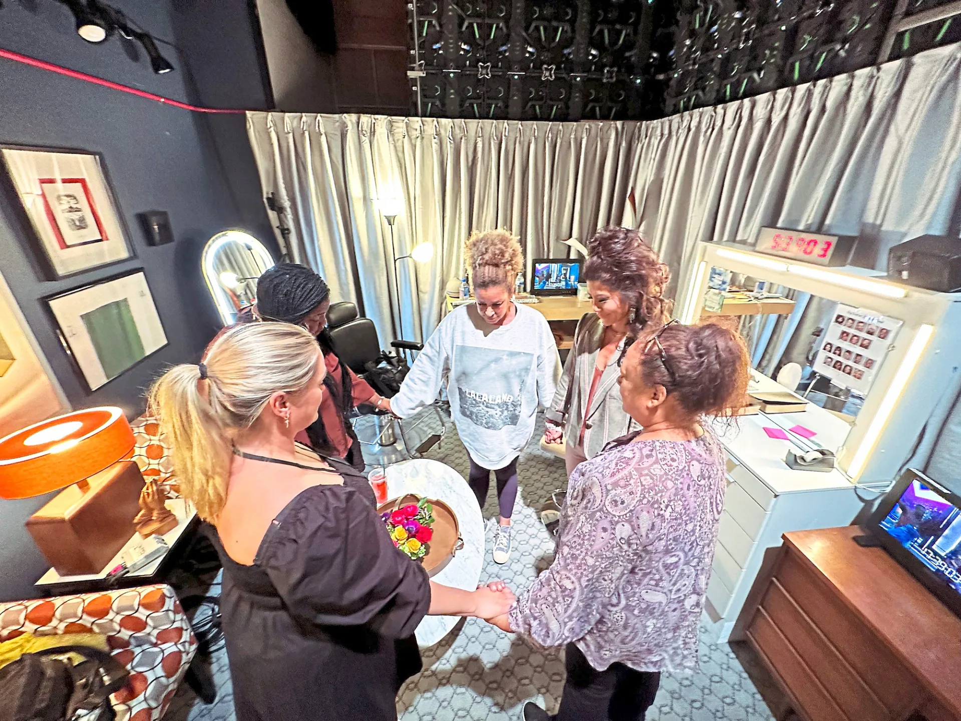 “Mic’d up and ready to go for a sound check followed by a quick rehearsal of the open of the show,” she tells Us about her final preparations before going live.