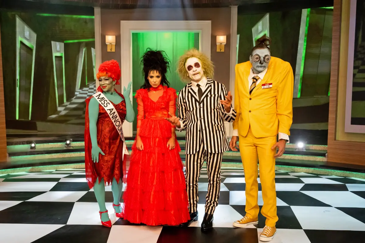 Ripa, 54, and Consuelos, 53, showed off their impressive ensembles during the Thursday, October 31, episode of Live With Kelly and Mark. The couple paid homage to the recent Beetlejuice sequel, titled Beetlejuice Beetlejuice. Consuelos portrayed the titular character in an uncanny striped suit, green wig and white face makeup. Ripa, meanwhile, dressed as Lydia Deetz in a red gown and towering black wig.