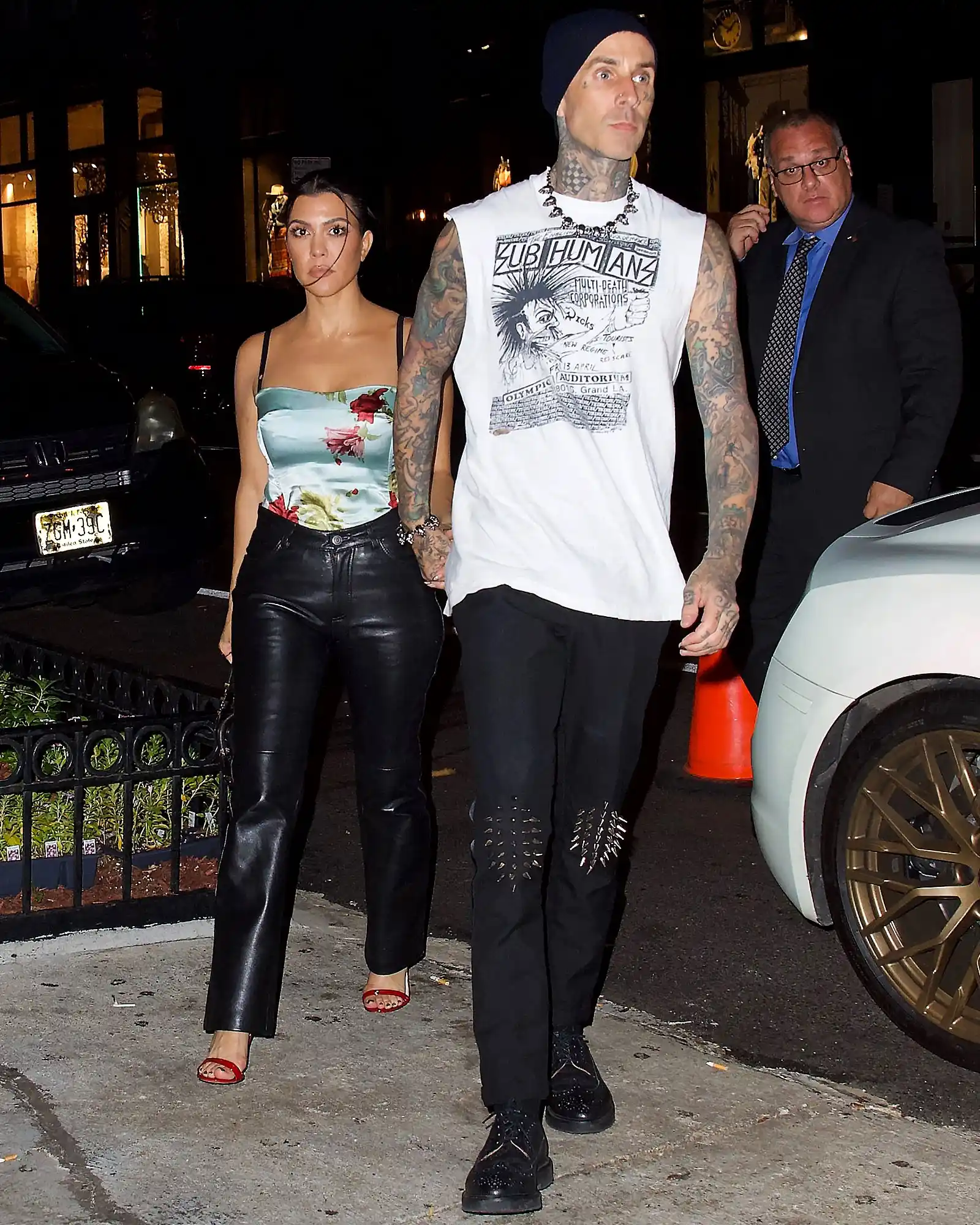 The Keeping Up With the Kardashians alum and the rocker also toned down their looks for dinner, with Kardashian sporting black leather pants and a blue floral top and Barker wearing black studded pants and a white tank top. Earlier in the evening, the twosome made their red carpet debut at the VMAs, packing on the PDA on the carpet.
