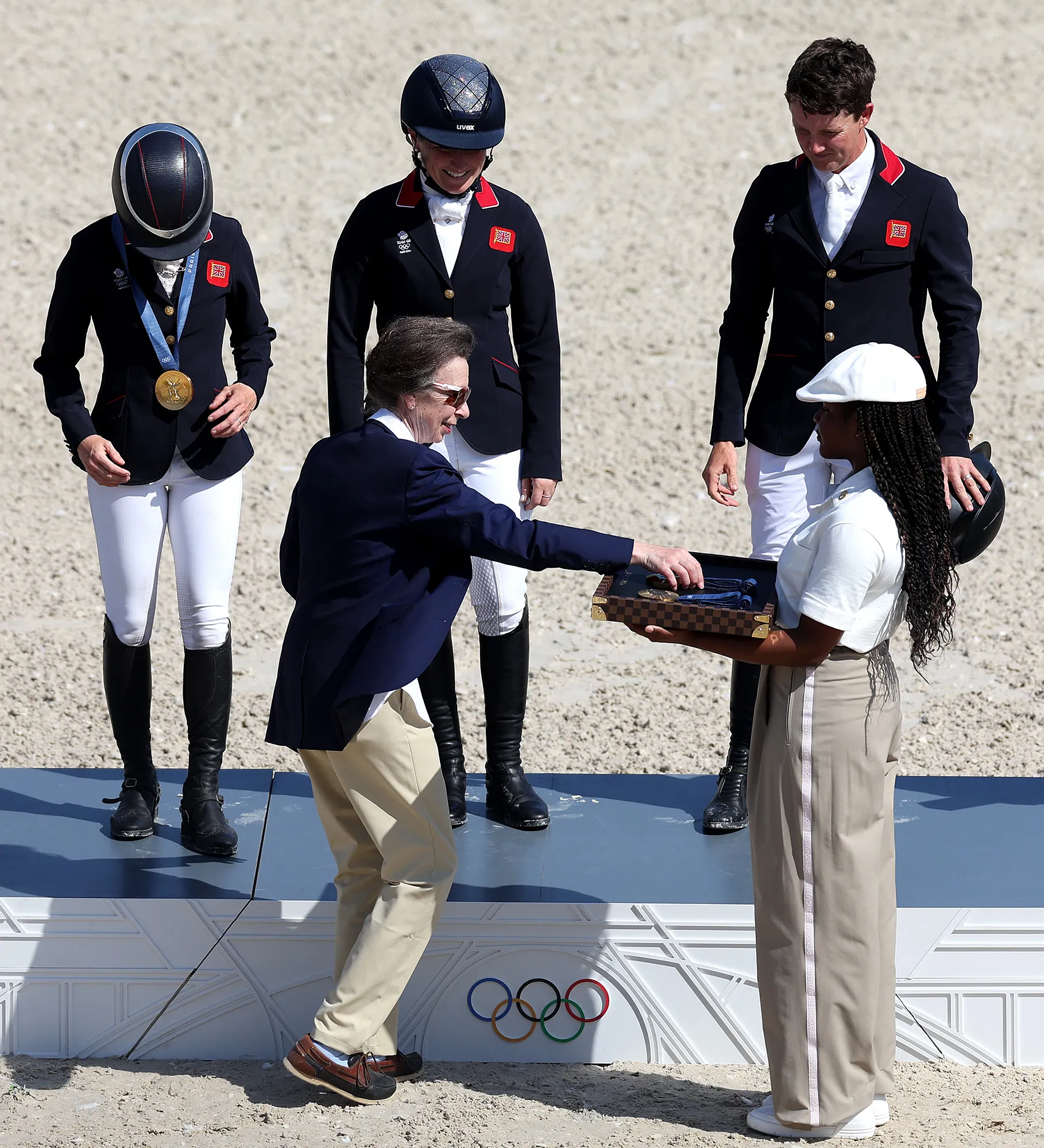 As the games officially kicked off, Anne was photographed in the stands during various sporting events. She even presented Great Britain with the gold medals following the Eventing team finals in Versailles on July 29.